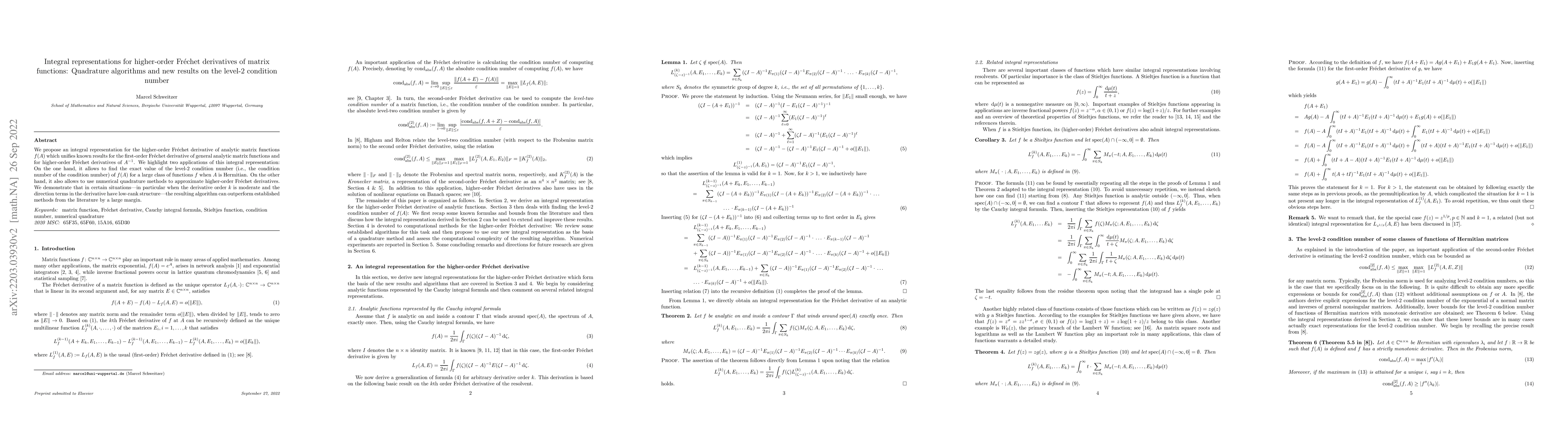 The paper proposes an integral representation for higher-order Fr\'echet derivatives of matrix functions, unifying known results for both first-order derivatives and higher-order derivatives of $A^{-1}$. It applies this representation to determine the level-2 condition number exactly for Hermitian matrices and to develop new quadrature algorithms for approximating higher-order Fr\'echet derivatives, which outperform existing methods in specific scenarios.