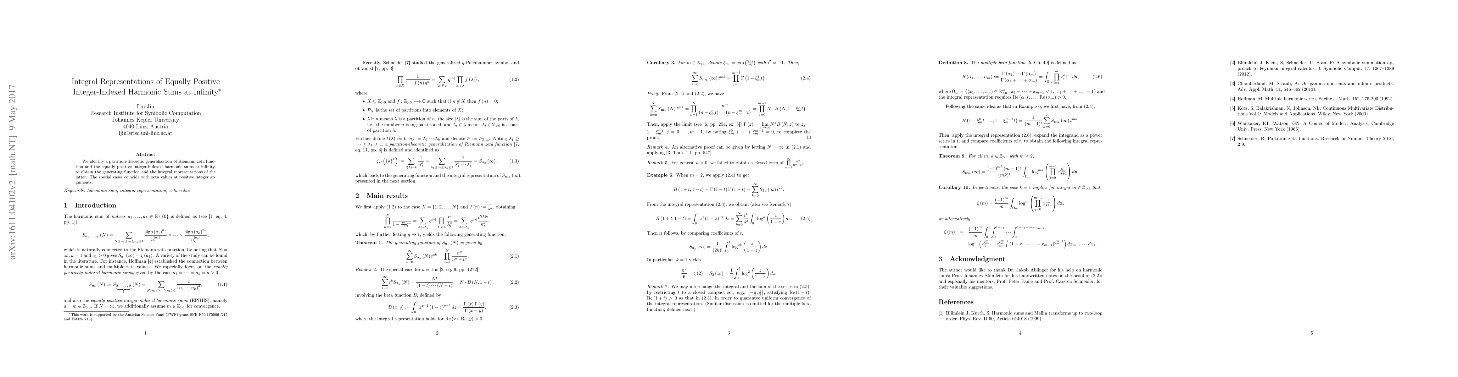 We identify a partition-theoretic generalization of Riemann zeta function and the equally positive integer-indexed harmonic sums at infinity, to obtain the generating function and the integral representations of the latter. The special cases coincide with zeta values at positive integer arguments.