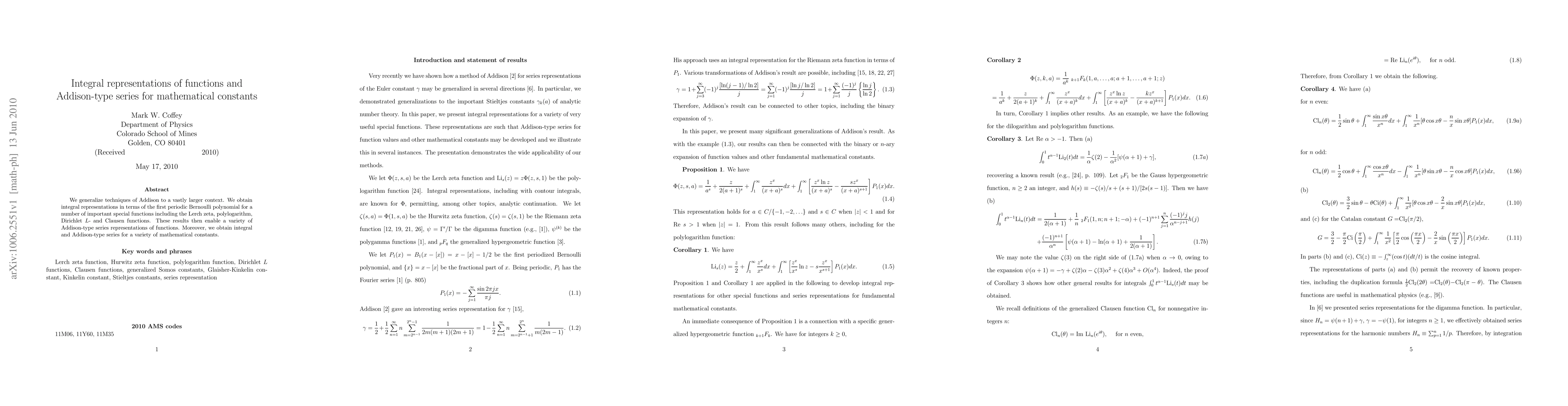 This paper generalizes Addison's techniques to derive integral representations using the first periodic Bernoulli polynomial for special functions like the Lerch zeta, polylogarithm, Dirichlet $L$-functions, and Clausen functions. It also provides Addison-type series representations for various mathematical constants.