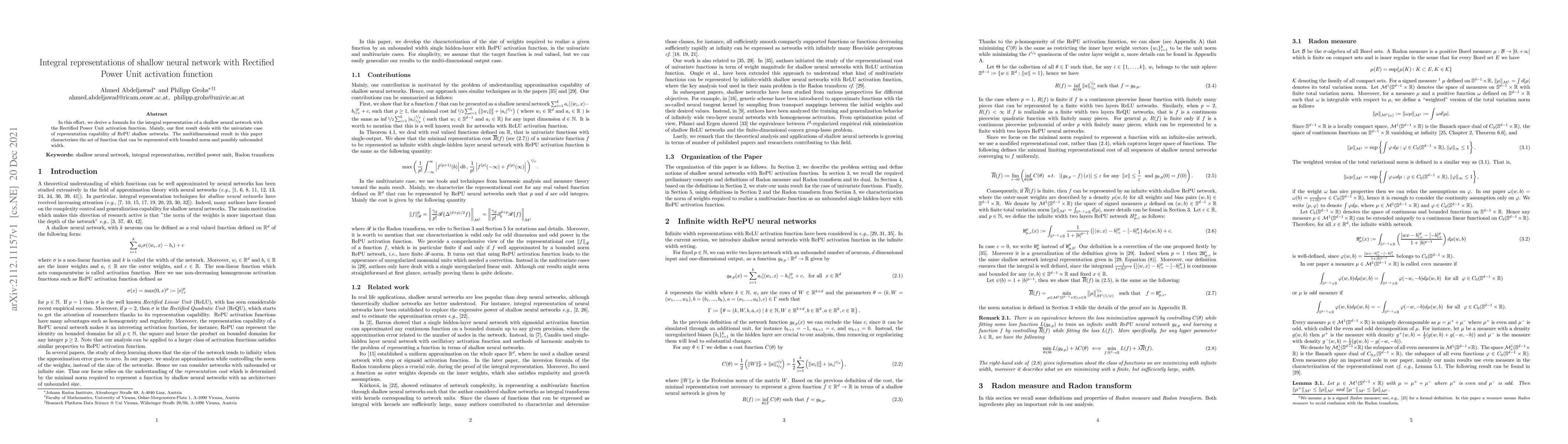 This paper derives an integral representation formula for shallow neural networks using the Rectified Power Unit (RePU) activation function, focusing on both univariate and multidimensional cases. It characterizes the set of functions that can be represented with bounded norm and potentially unbounded width.