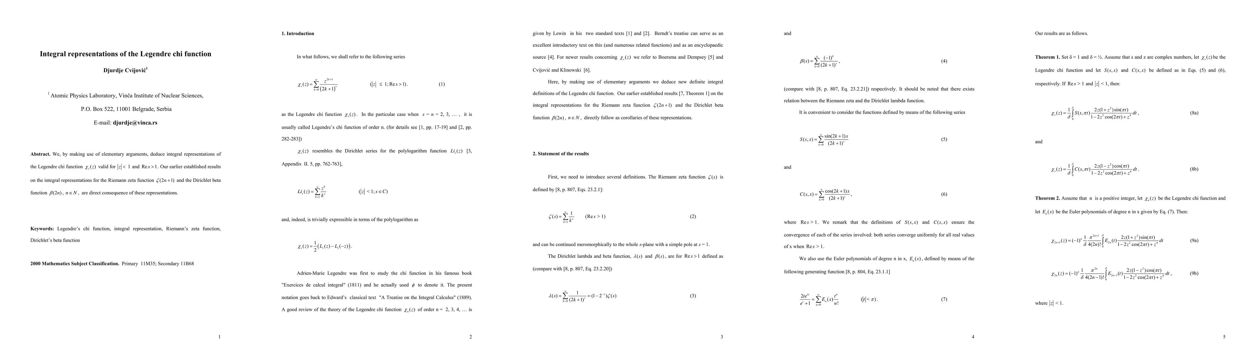 This paper derives integral representations for the Legendre chi function $\chi_{s}(x)$ using elementary arguments, valid for $|z|<1$ and $\Re(s)>1.$ These results also extend to earlier findings on the Riemann zeta function $\zeta(2 n+1)$ and the Dirichlet beta function $\beta(2 n)$.
