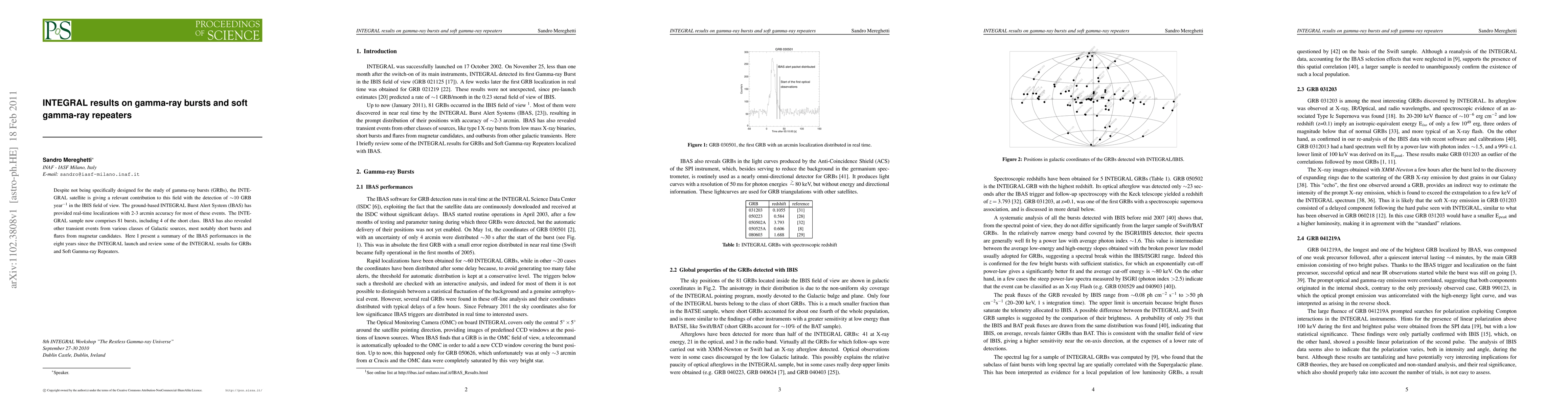 The INTEGRAL satellite, primarily for other purposes, detects about 10 gamma-ray bursts (GRBs) annually, providing real-time localizations with 2-3 arcmin accuracy. The INTEGRAL Burst Alert System (IBAS) has contributed significantly to the study of GRBs and Soft Gamma-ray Repeaters, revealing transient events from various Galactic sources.