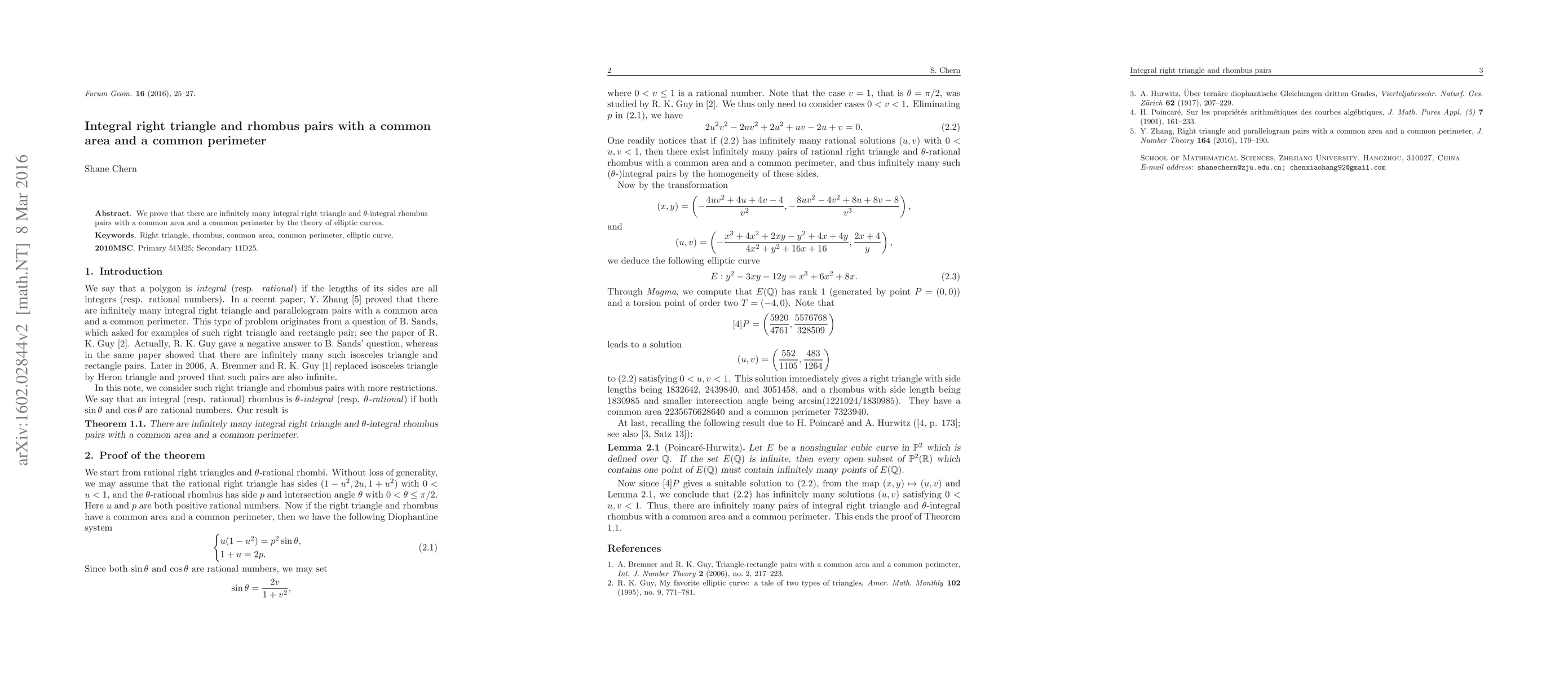 Researchers prove the existence of infinitely many pairs of integral right triangles and rhombuses with shared area and perimeter using elliptic curve theory.