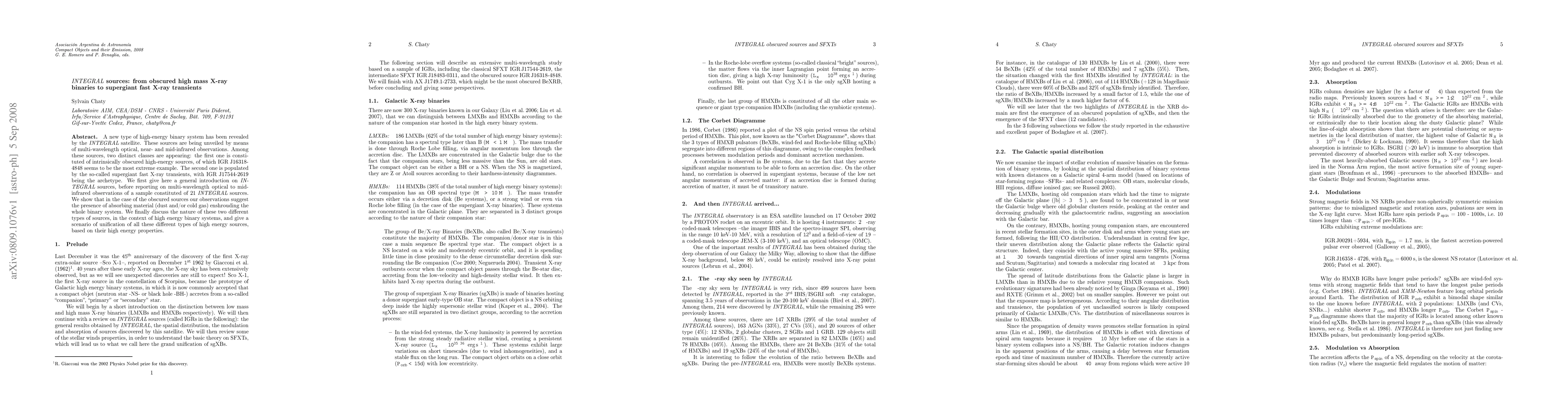 A new type of high-energy binary system has been revealed by the INTEGRAL satellite. These sources are being unveiled by means of multi-wavelength optical, near- and mid-infrared observations. Among these sources, two distinct classes are appearing: the first one is constituted of intrinsically obscured high-energy sources, of which IGR J16318-4848 seems to be the most extreme example. The second one is populated by the so-called supergiant fast X-ray transients, with IGR J17544-2619 being the archetype. We first give here a general introduction on INTEGRAL sources, before reporting on multi-wavelength optical to mid-infrared observations of a sample constituted of 21 INTEGRAL sources. We show that in the case of the obscured sources our observations suggest the presence of absorbing material (dust and/or cold gas) enshrouding the whole binary system. We finally discuss the nature of these two different types of sources, in the context of high energy binary systems, and give a scenario of unification of all these different types of high energy sources, based on their high energy properties.