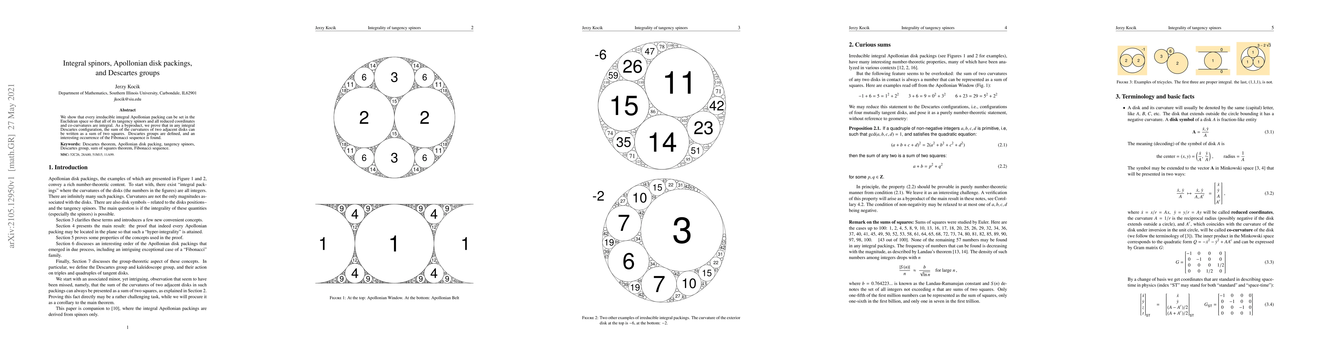 This paper demonstrates that every irreducible integral Apollonian disk packing can be embedded in Euclidean space with all tangency spinors and curvatures being integral. It also proves that in any integral Descartes configuration, the sum of curvatures of two adjacent disks is a sum of two squares, introducing Descartes groups and noting the Fibonacci sequence's appearance.