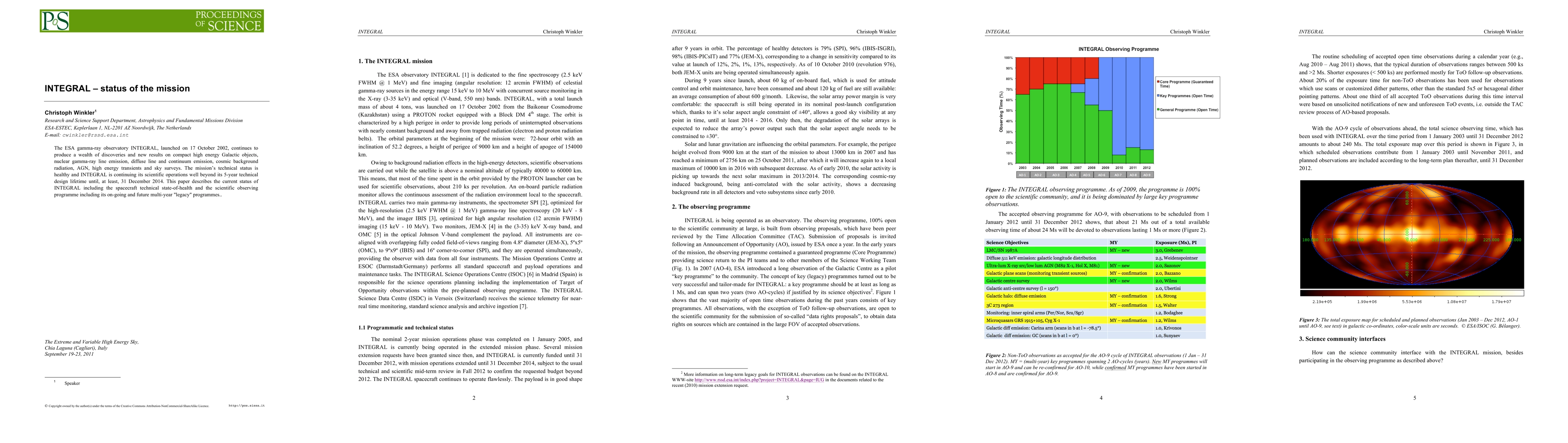 The paper describes the current status of the ESA gamma-ray observatory INTEGRAL, focusing on its technical health and scientific observing program, including ongoing and future multi-year 'legacy' programs.