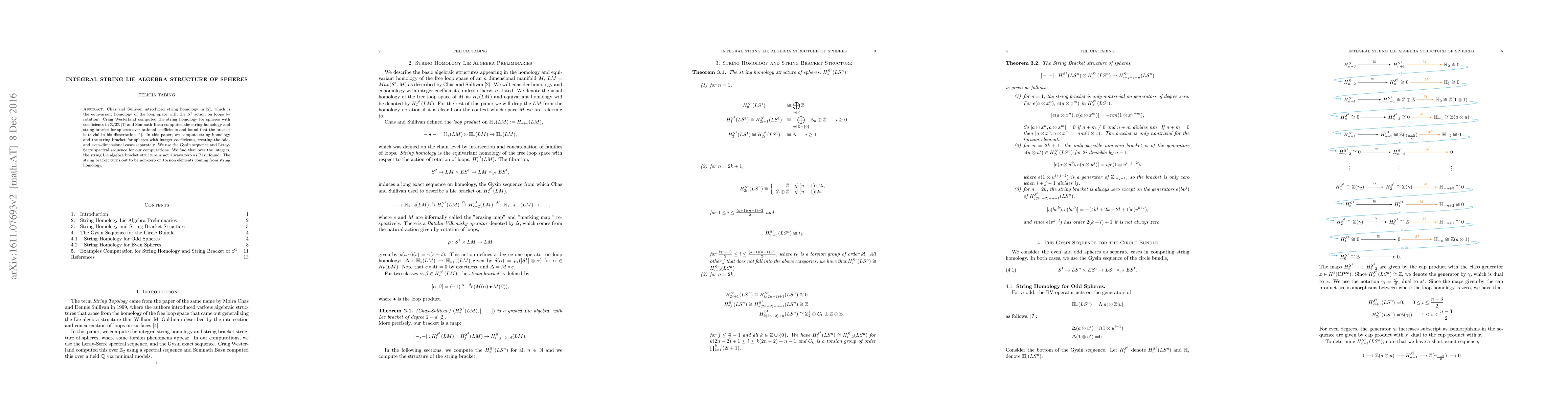 This paper computes string homology and the string bracket for spheres with integer coefficients, revealing that the string Lie algebra bracket structure is non-zero on torsion elements, contrary to previous findings with rational coefficients. The computations utilize the Gysin sequence and Leray-Serre spectral sequence.