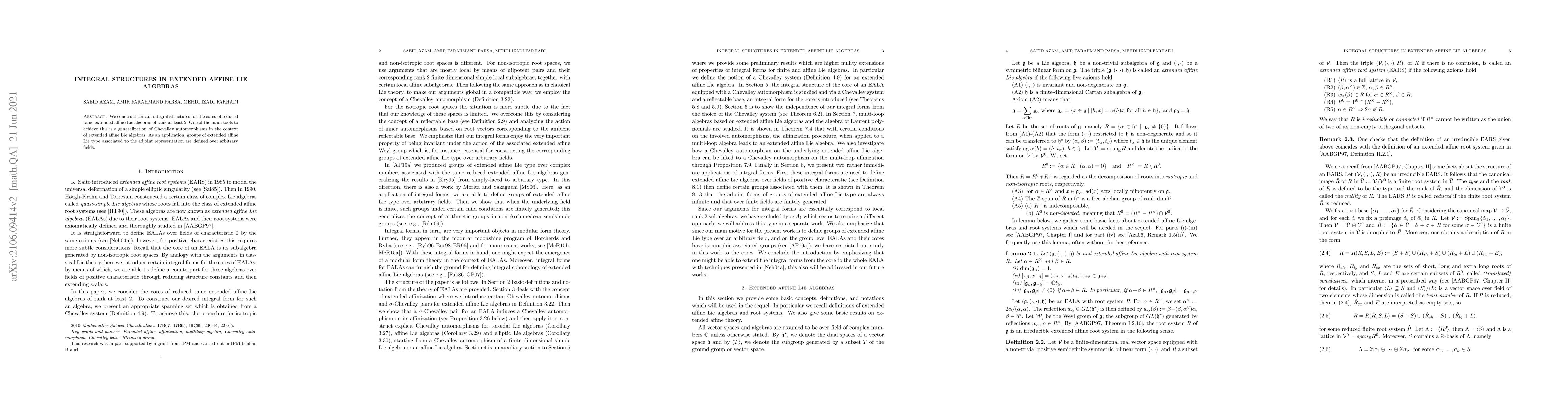 We construct certain integral structures for the cores of reduced tame extended affine Lie algebras of rank at least 2. One of the main tools to achieve this is a generalization of Chevalley automorphisms in the context of extended affine Lie algebras. As an application, groups of extended affine Lie type associated to the adjoint representation are defined over arbitrary fields.