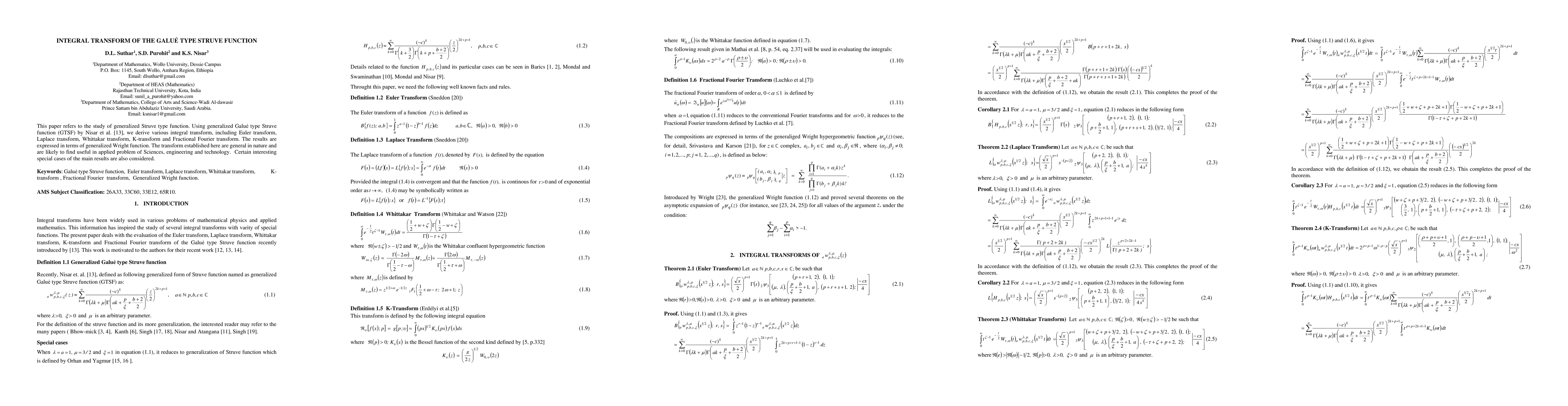 This paper refers to the study of generalized Struve type function. Using generalized Galue type Struve function (GTSF) by Nisar et al. [13], we derive various integral transform, including Euler transform, Laplace transform, Whittakar transform, K-transform and Fractional Fourier transform. The results are expressed in terms of generalized Wright function. The transform established here are general in nature and are likely to find useful in applied problem of Sciences, engineering and technology. Certain interesting special cases of the main results are also considered.