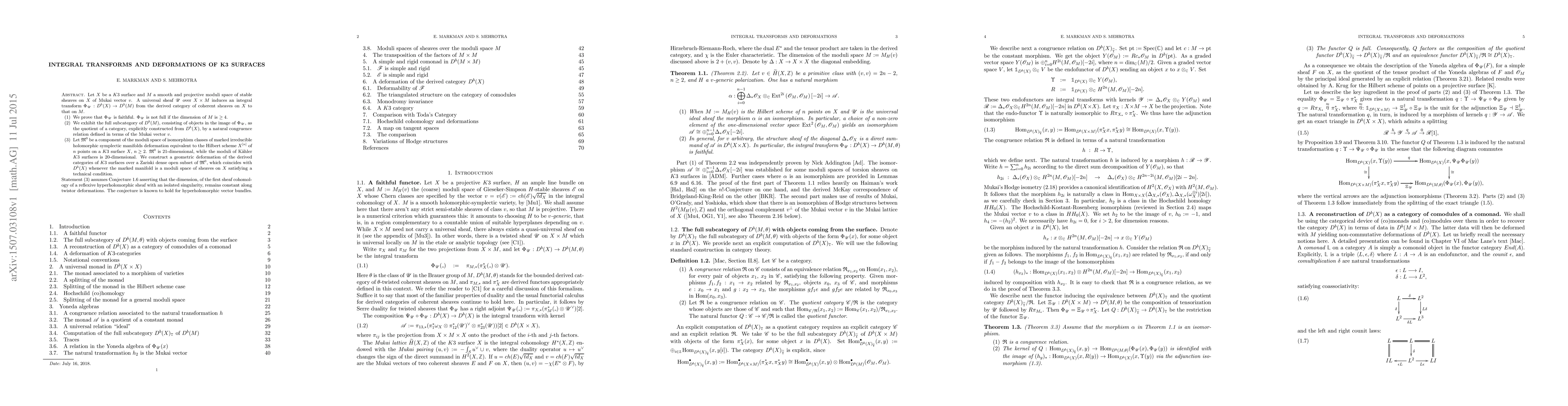 This paper proves the faithfulness of the integral transform F from the derived category of coherent sheaves on a K3 surface to that on its moduli space of stable sheaves, while noting it is not full if the dimension of the moduli space exceeds 2. It also constructs a full subcategory of the derived category on the moduli space as a quotient category from the original K3 surface's derived category. Additionally, the paper explores deformations of derived categories of K3 surfaces over a specific deformation space of marked holomorphic symplectic manifolds.