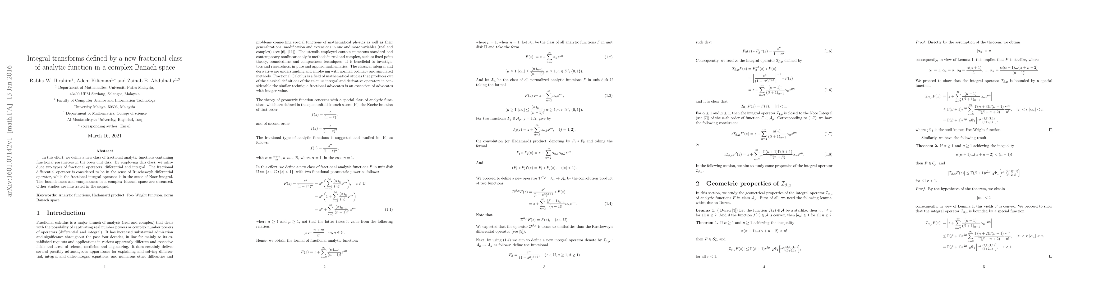 In this work, we define a new class of fractional analytic functions containing functional parameters in the open unit disk. By employing this class, we introduce two types of fractional operators, differential and integral. The fractional differential operator is considered to be in the sense of Ruscheweyh differential operator, while the fractional integral operator is in the sense of Noor integral. The boundedness and compactness in a complex Banach space are discussed. Other studies are illustrated in the sequel.
