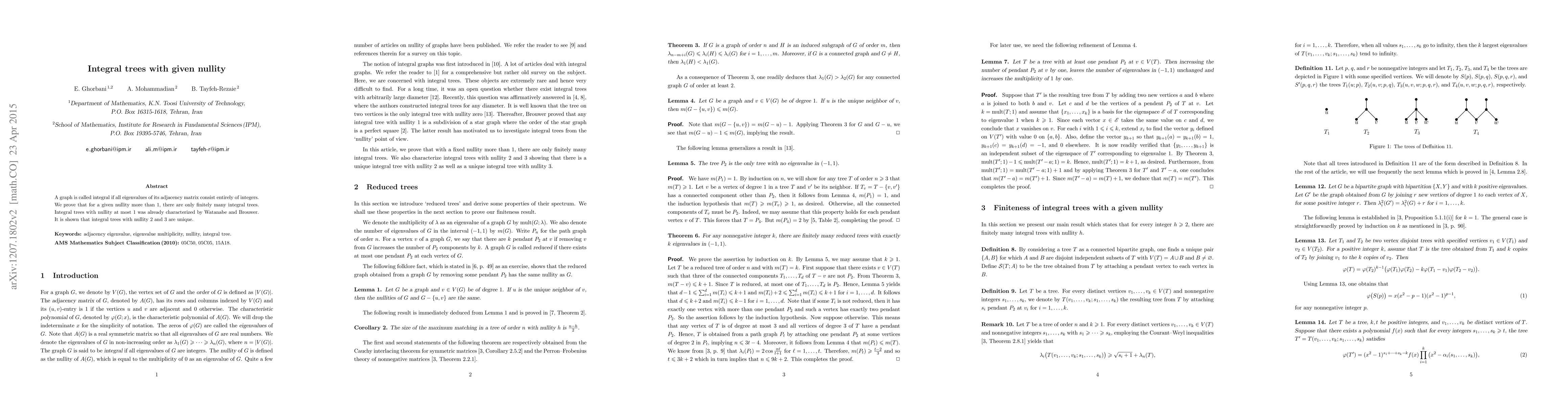 Summary: This paper proves that for integral trees—graphs with integer eigenvalues in their adjacency matrices—there exist only finitely many such trees when the nullity exceeds one. Additionally, it demonstrates that integral trees with nullities of 2 and 3 are unique.