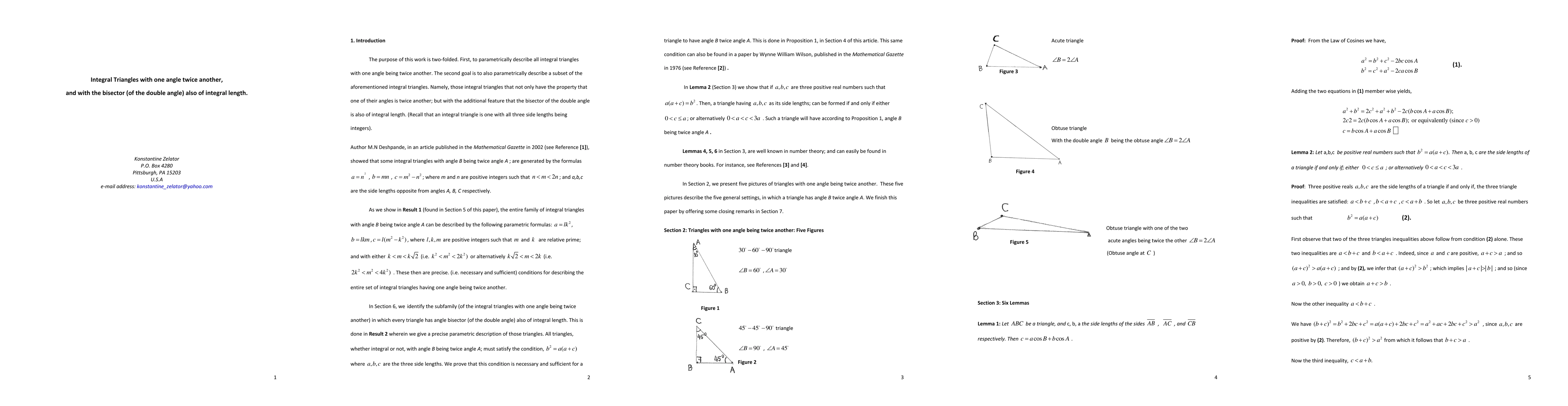 Research proves that integral triangles can exist when angle B is twice angle A, and the bisector of angle B has an integral length, with two possible conditions for triangle formation.