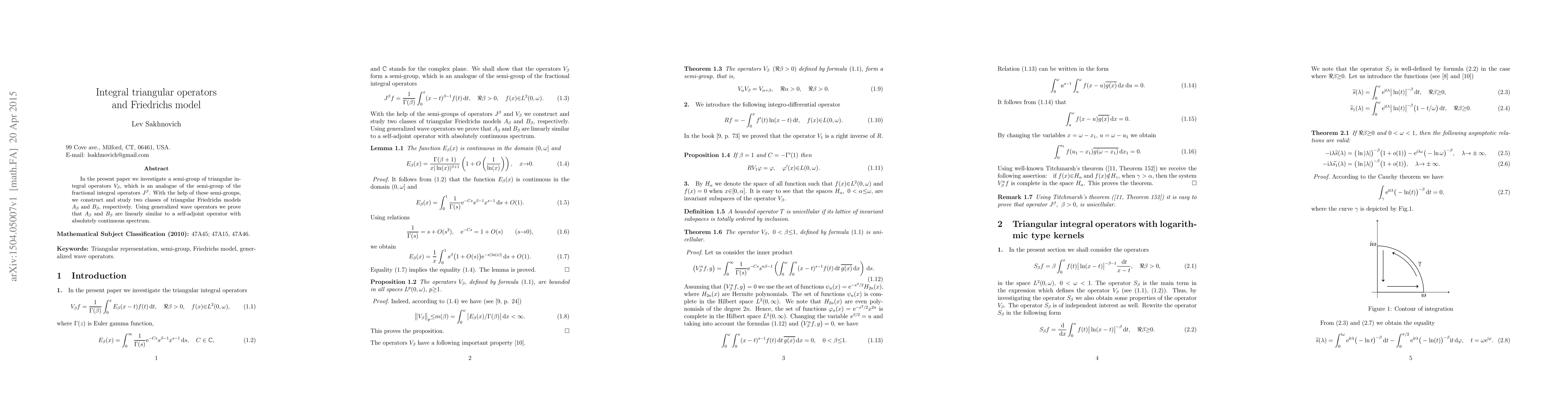 This paper explores a semi-group of triangular integral operators $V_{\beta}$ analogous to fractional integral operators, and constructs two classes of Friedrichs models $A_{\beta}$ and $B_{\beta}$. It proves that these models are linearly similar to a self-adjoint operator with an absolutely continuous spectrum using generalized wave operators.