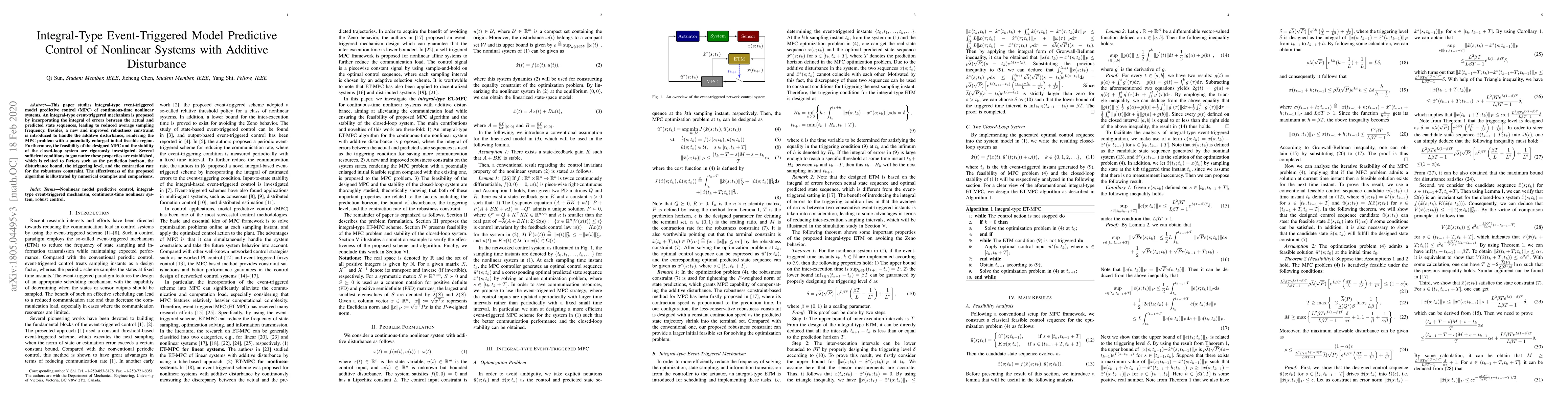 This paper proposes an integral-type event-triggered model predictive control (MPC) for nonlinear systems, reducing the average sampling frequency and enhancing robustness against additive disturbances. Sufficient conditions for feasibility and stability are rigorously investigated and validated through numerical examples.