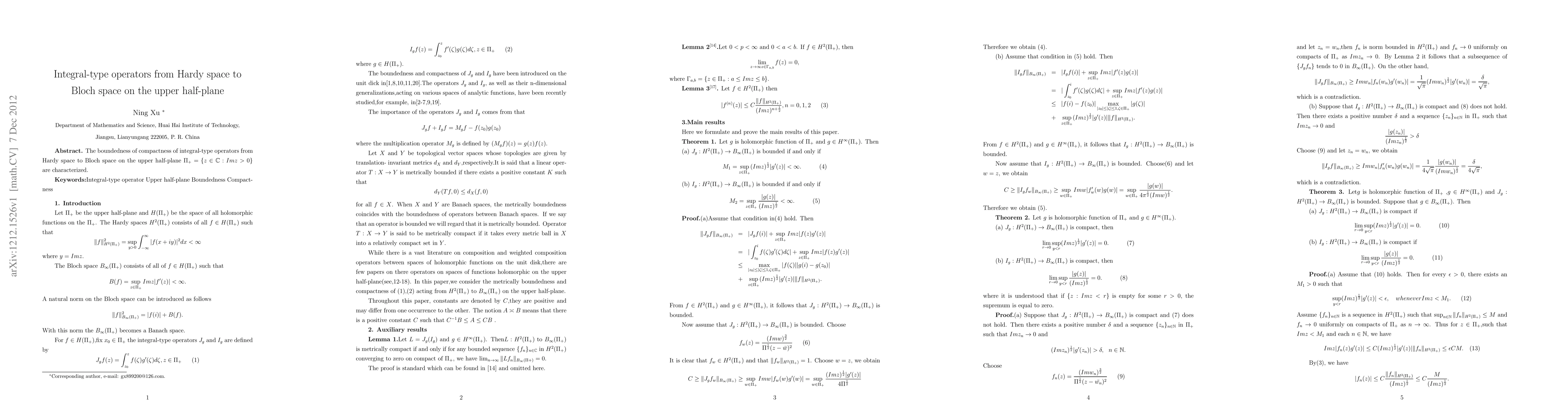 The research characterizes the boundedness of compactness of integral-type operators from Hardy space to Bloch space on the upper half-plane, providing a characterization of their properties.