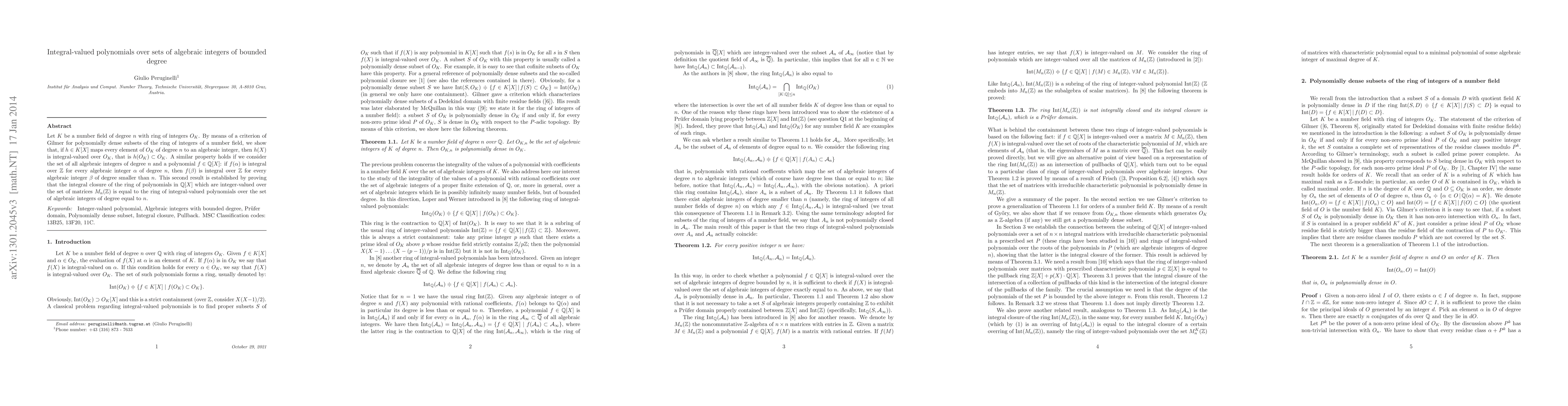 This paper demonstrates that polynomials mapping algebraic integers of a specific degree in a number field to algebraic integers are integral-valued over the ring of integers of that field. It also establishes a similar property for polynomials evaluated at algebraic integers of bounded degree, showing that integrality over integers extends to smaller degrees.