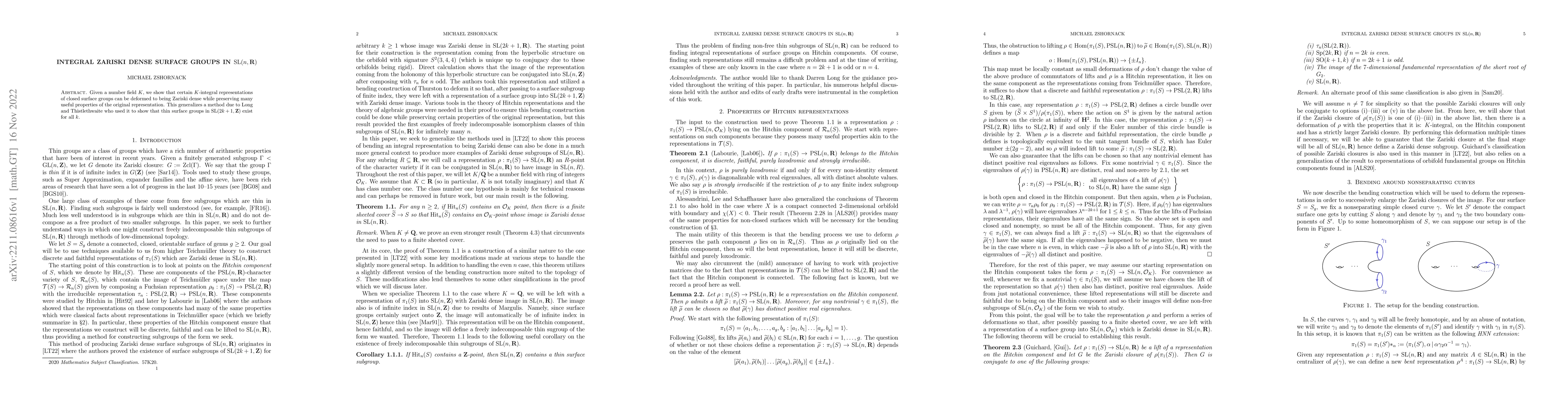 This paper demonstrates how $K$-integral representations of closed surface groups can be modified to become Zariski dense while maintaining key properties, extending a technique originally used to prove the existence of thin surface groups in $\operatorname{SL}(2k+1,\mathbf{Z})$. This generalizes results from Long and Thistlethwaite.
