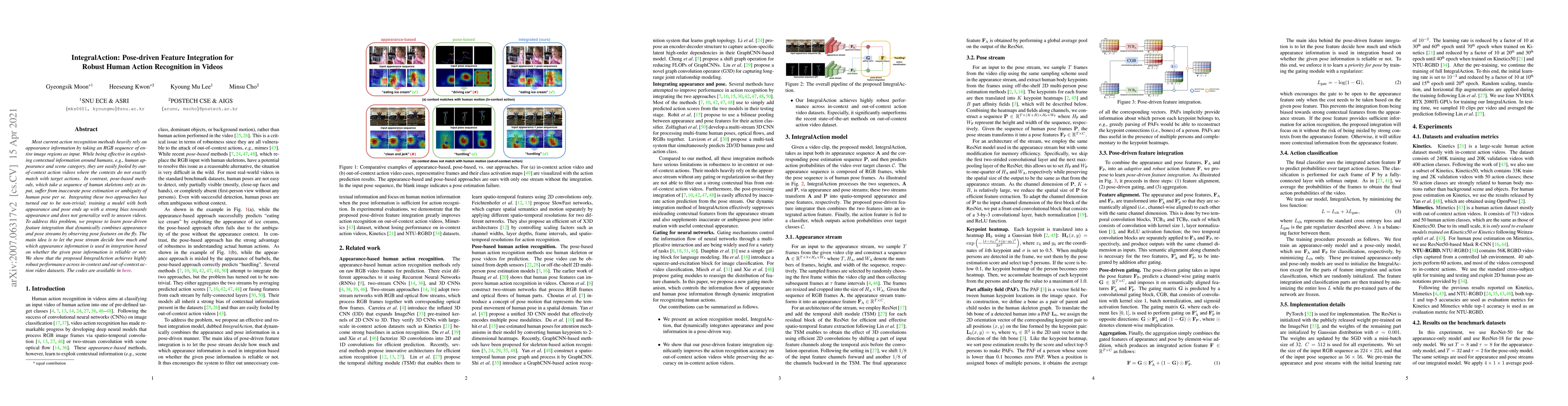 Most current action recognition methods heavily rely on appearance information by taking an RGB sequence of entire image regions as input. While being effective in exploiting contextual information around humans, e.g., human appearance and scene category, they are easily fooled by out-of-context action videos where the contexts do not exactly match with target actions. In contrast, pose-based methods, which take a sequence of human skeletons only as input, suffer from inaccurate pose estimation or ambiguity of human pose per se. Integrating these two approaches has turned out to be non-trivial; training a model with both appearance and pose ends up with a strong bias towards appearance and does not generalize well to unseen videos. To address this problem, we propose to learn pose-driven feature integration that dynamically combines appearance and pose streams by observing pose features on the fly. The main idea is to let the pose stream decide how much and which appearance information is used in integration based on whether the given pose information is reliable or not. We show that the proposed IntegralAction achieves highly robust performance across in-context and out-of-context action video datasets. The codes are available in https://github.com/mks0601/IntegralAction_RELEASE.