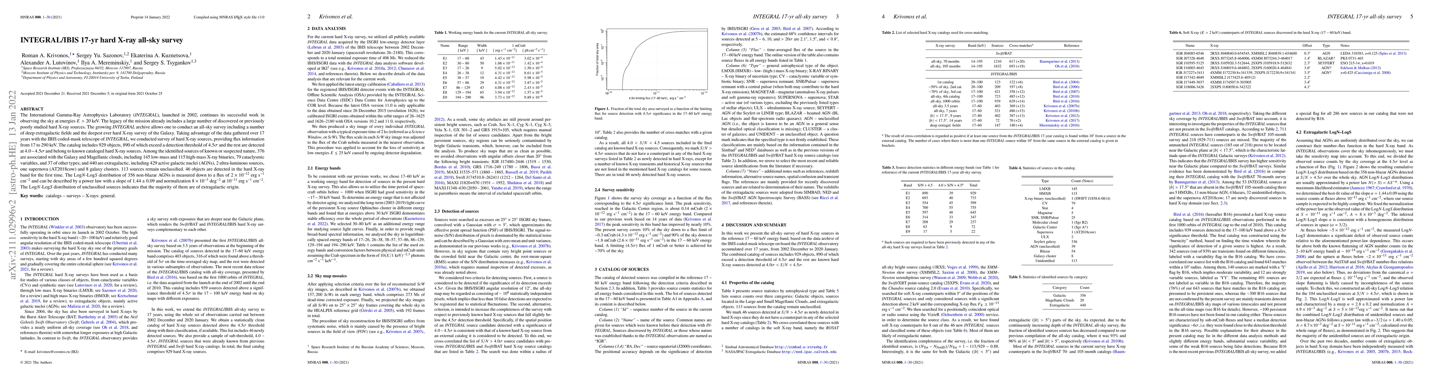 The INTEGRAL/IBIS 17-year hard X-ray all-sky survey catalogs 929 sources, including 46 newly detected objects, with 376 sources associated with the Galaxy and 440 extragalactic, primarily active galactic nuclei. The survey provides flux information from 17 to 290 keV and reveals a LogN-LogS distribution for non-blazar AGNs.
