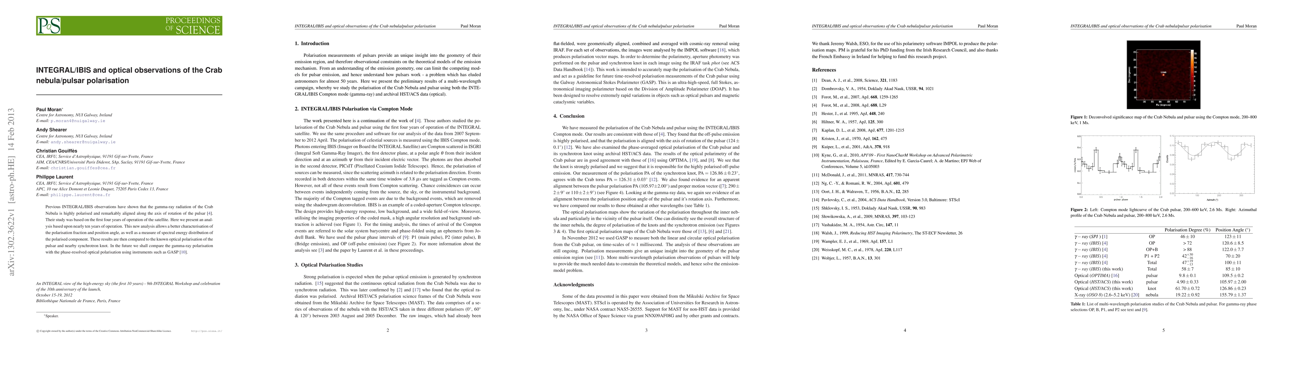 Previous INTEGRAL/IBIS observations have shown that the gamma-ray radiation of the Crab Nebula is highly polarised and remarkably aligned along the axis of rotation of the pulsar (Forot et al. 2008). Their study was based on the first four years of operation of the satellite. Here we present an analysis based upon nearly ten years of operation. This new analysis allows a better characterisation of the polarisation fraction and position angle, as well as a measure of spectral energy distribution of the polarised component. These results are then compared to the known optical polarisation of the pulsar and nearby synchrotron knot. In the future we shall compare the gamma-ray polarisation with the phase-resolved optical polarisation using instruments such as GASP (Kyne et al. 2010).