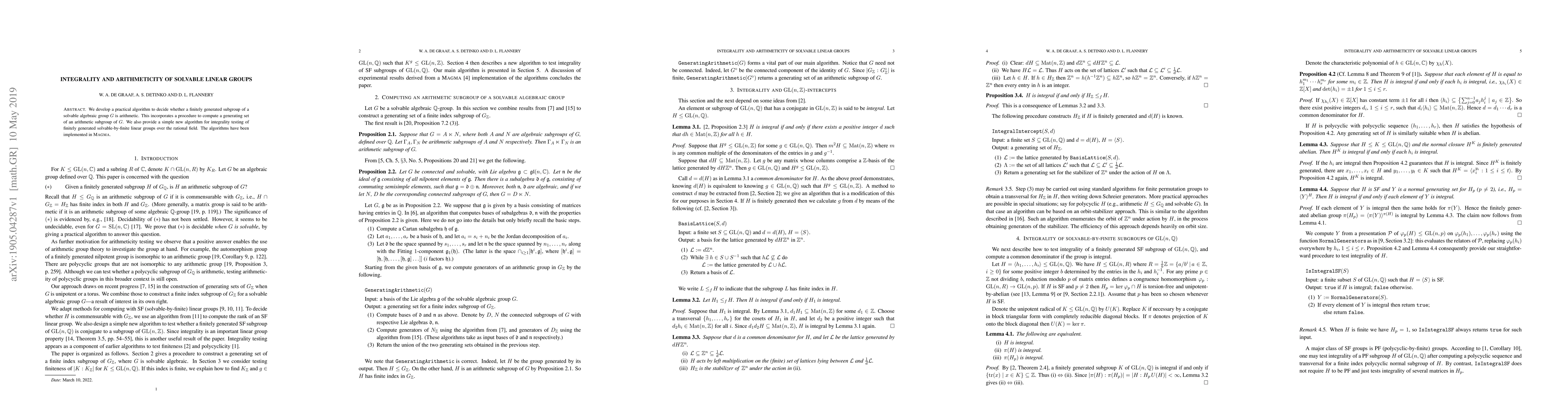 We develop a practical algorithm to decide whether a finitely generated subgroup of a solvable algebraic group $G$ is arithmetic. This incorporates a procedure to compute a generating set of an arithmetic subgroup of $G$. We also provide a simple new algorithm for integrality testing of finitely generated solvable-by-finite linear groups over the rational field. The algorithms have been implemented in {\sc Magma}.