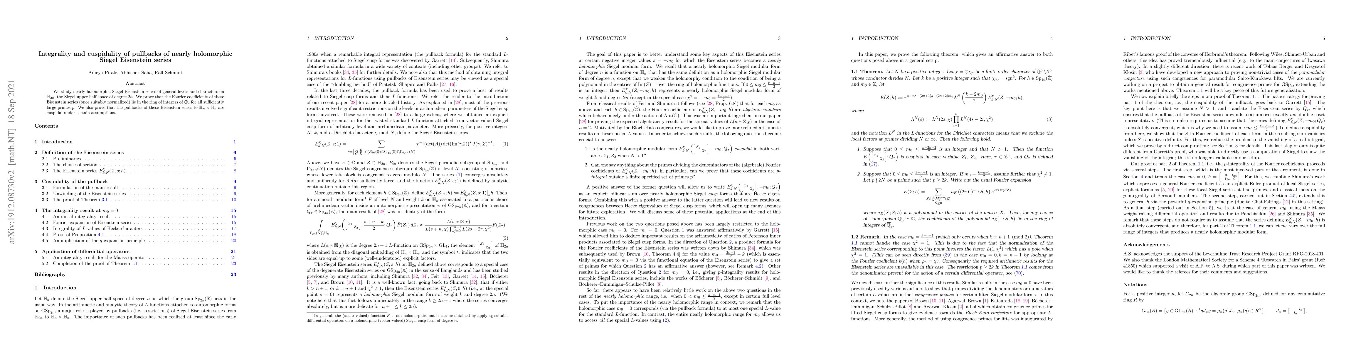This paper investigates nearly holomorphic Siegel Eisenstein series on $\mathbb{H}_{2n}$ and proves that their Fourier coefficients lie in $\mathbb{Q}_p$ for large primes $p$. It also demonstrates that the pullbacks of these series to $\mathbb{H}_n \times \mathbb{H}_n$ are cuspidal under specific conditions.