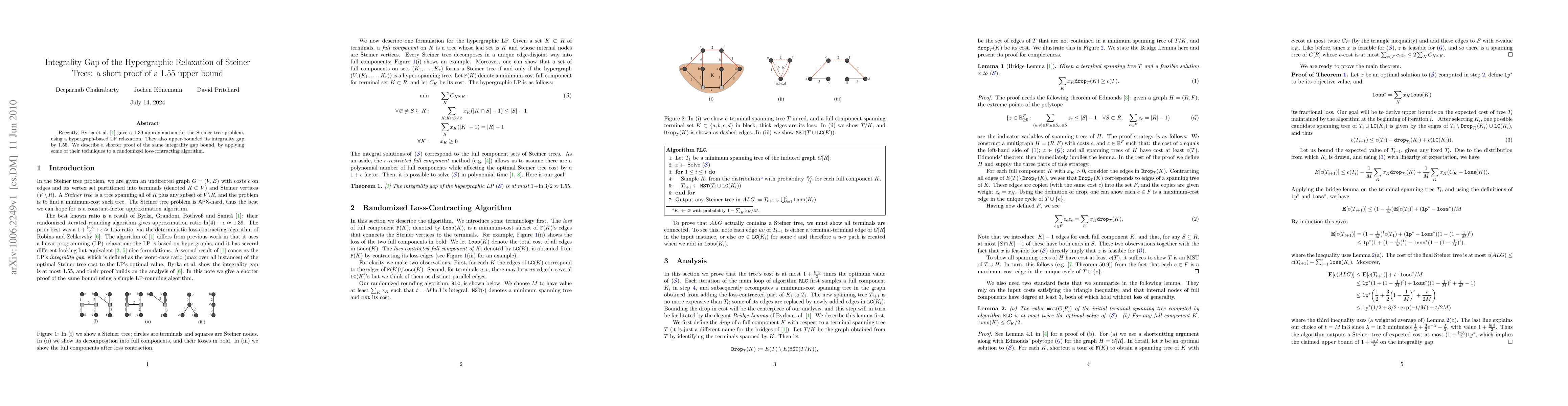 This paper presents a concise proof for the 1.55 upper bound on the integrality gap of the hypergraphic relaxation used in the Steiner tree problem, utilizing techniques from a randomized loss-contracting algorithm to streamline the approach.
