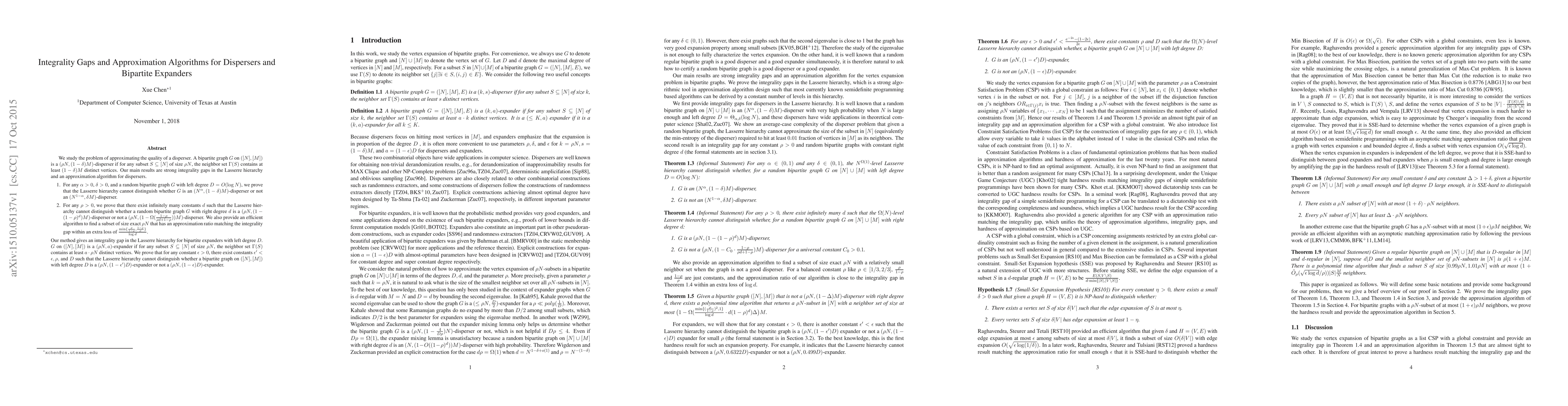 This paper explores the approximation quality of bipartite graph dispersers and expanders, demonstrating strong integrality gaps in the Lasserre hierarchy for both. It also presents an efficient algorithm for finding disperser subsets with an approximation ratio matching the integrality gap.