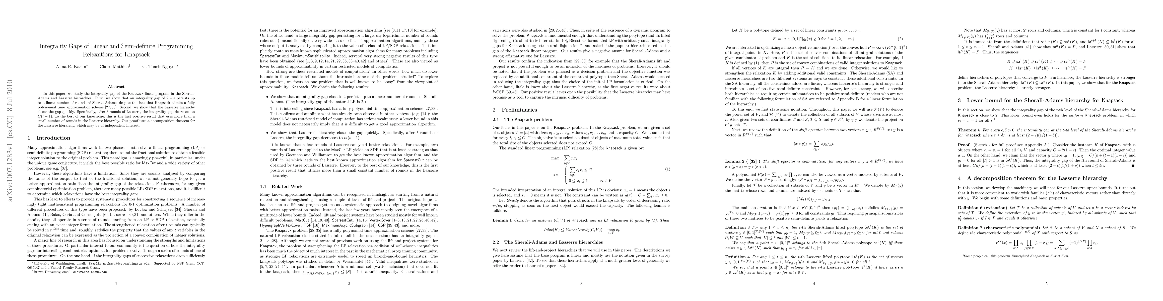 This paper investigates the integrality gaps of linear and semi-definite programming relaxations for the Knapsack problem, showing that while the Sherali-Adams hierarchy maintains a gap of 2 - ε up to a linear number of rounds, the Lasserre hierarchy significantly reduces the gap to t/(t - 1) after t rounds, marking a notable advancement in the use of higher rounds.