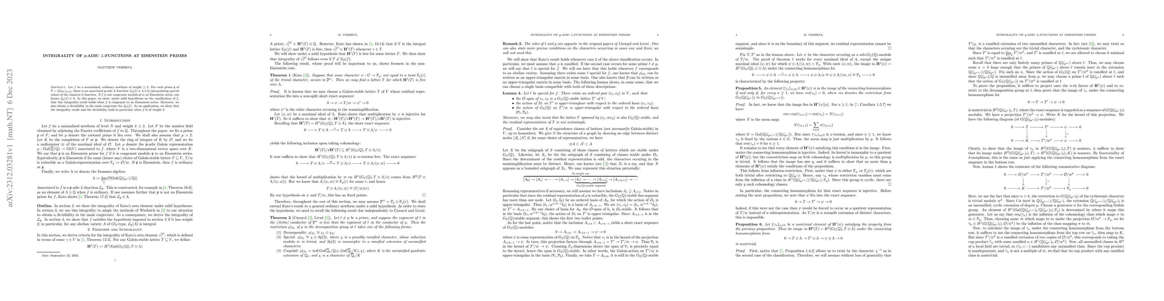 Let $f$ be a normalized, ordinary newform of weight $\ge 2$. For each prime $\mathfrak{p}$ of $F=\mathbb{Q}(a_n)_{n\in \mathbb{N}}$, there is an associated $\mathfrak{p}$-adic $L$-function $\mathcal{L}_\mathfrak{p}(f)\in \Lambda \otimes \mathbb{Q}$ interpolating special values of the classical $L$-function. If $f$ is not congruent modulo $\mathfrak{p}$ to an Eisenstein series, one knows $\mathcal{L}_\mathfrak{p}(f)\in \Lambda$. In this paper, we show, under mild hypotheses on the ramification of $f$, that this integrality result holds when $f$ is congruent to an Eisenstein series. Moreover, we also obtain a divisibility in the main conjecture for $\mathcal{L}_\mathfrak{p}(f)$. As an application, we show that the integrality result and the divisibility hold in particular when $f$ is of weight $2$.