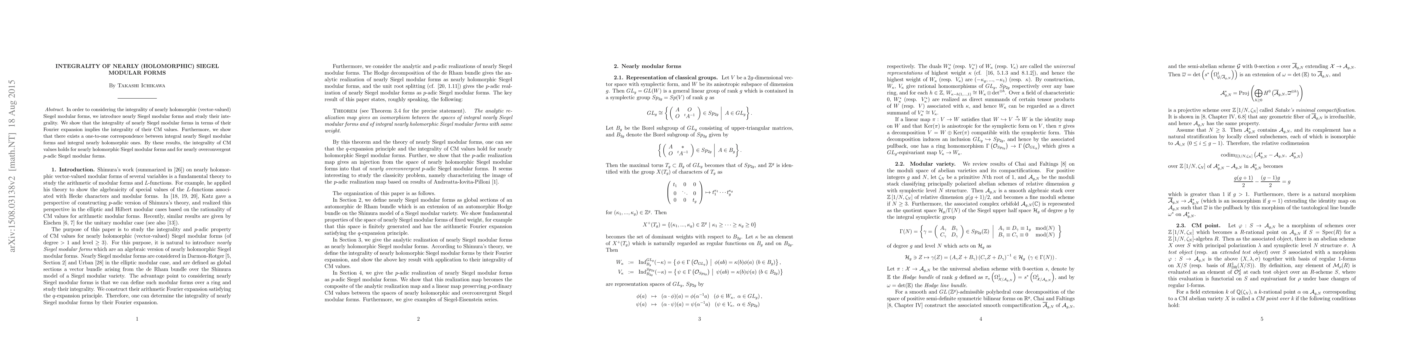 This paper introduces nearly Siegel modular forms and investigates their integrality through their Fourier expansion, demonstrating that their integrality implies the integrality of their CM values. It establishes a correspondence between integral nearly Siegel modular forms and integral nearly holomorphic ones, thereby proving the integrality of CM values for nearly holomorphic and nearly overconvergent p-adic Siegel modular forms.