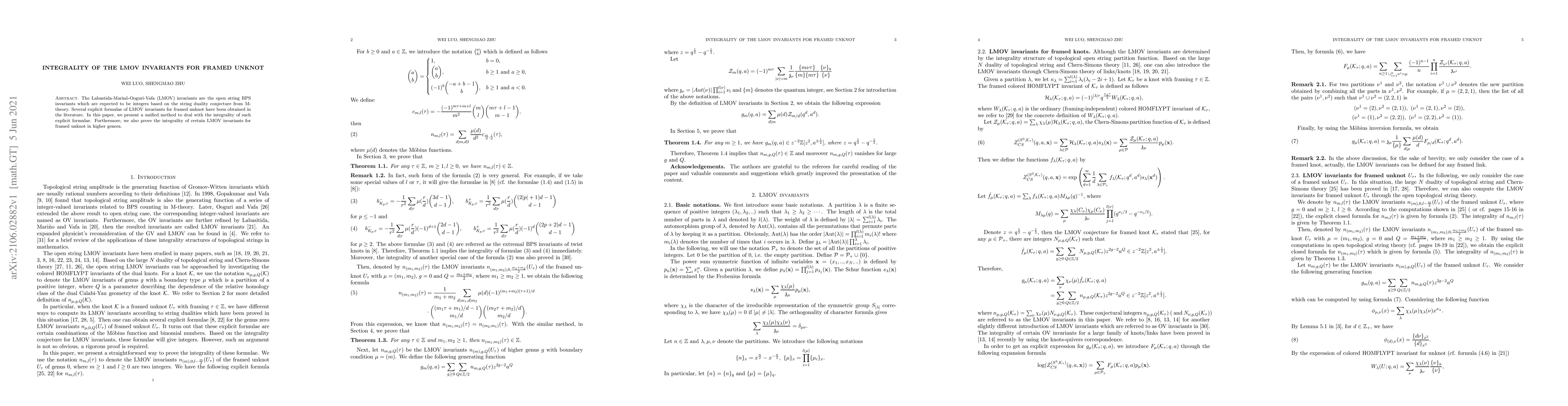 This paper presents a unified method to prove the integrality of explicit formulae for LMOV invariants associated with framed unknots, and extends the proof to higher genera, confirming their expected integer nature based on string duality conjectures.