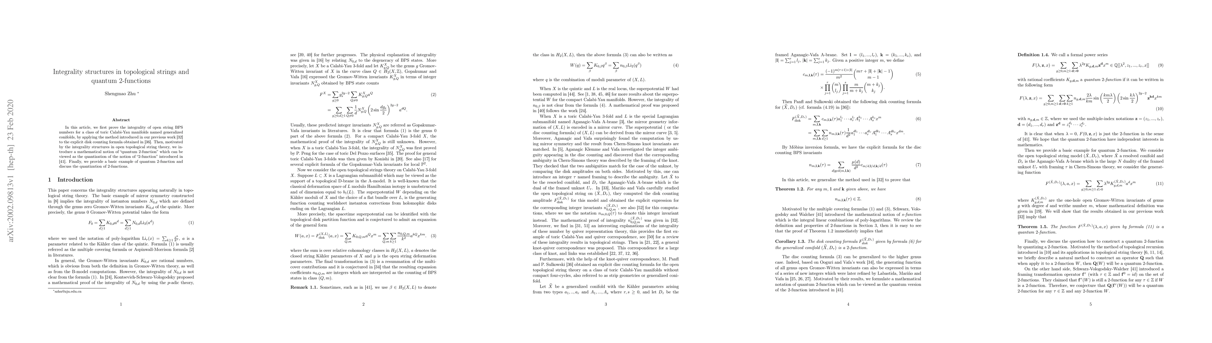 In this article, we first prove the integrality of open string BPS numbers for a class of toric Calabi-Yau manifolds named generalized conifolds, by applying the method introduced in our previous work \cite{LZ} to the explicit disk counting formula obtained in \cite{PS}. Then, motivated by the integrality structures in open topological string theory, we introduce a mathematical notion of ``quantum 2-function'' which can be viewed as the quantization of the notion of ``2-function'' introduced in \cite{SVW1}. Finally, we provide a basic example of quantum 2-function and discuss the quantization of 2-functions.