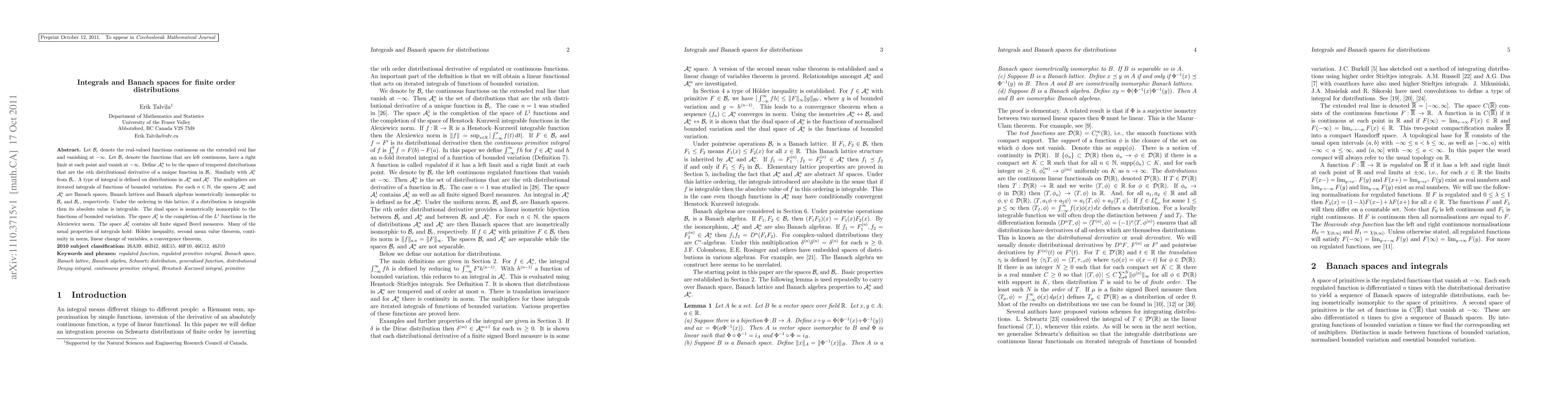 Let $\Bc$ denote the real-valued functions continuous on the extended real line and vanishing at $-\infty$. Let $\Br$ denote the functions that are left continuous, have a right limit at each point and vanish at $-\infty$. Define $\acn$ to be the space of tempered distributions that are the $n$th distributional derivative of a unique function in $\Bc$. Similarly with $\arn$ from $\Br$. A type of integral is defined on distributions in $\acn$ and $\arn$. The multipliers are iterated integrals of functions of bounded variation. For each $n\in\N$, the spaces $\acn$ and $\arn$ are Banach spaces, Banach lattices and Banach algebras isometrically isomorphic to $\Bc$ and $\Br$, respectively. Under the ordering in this lattice, if a distribution is integrable then its absolute value is integrable. The dual space is isometrically isomorphic to the functions of bounded variation. The space $\ac^1$ is the completion of the $L^1$ functions in the Alexiewicz norm. The space $\ar^1$ contains all finite signed Borel measures. Many of the usual properties of integrals hold: H\"older inequality, second mean value theorem, continuity in norm, linear change of variables, a convergence theorem.