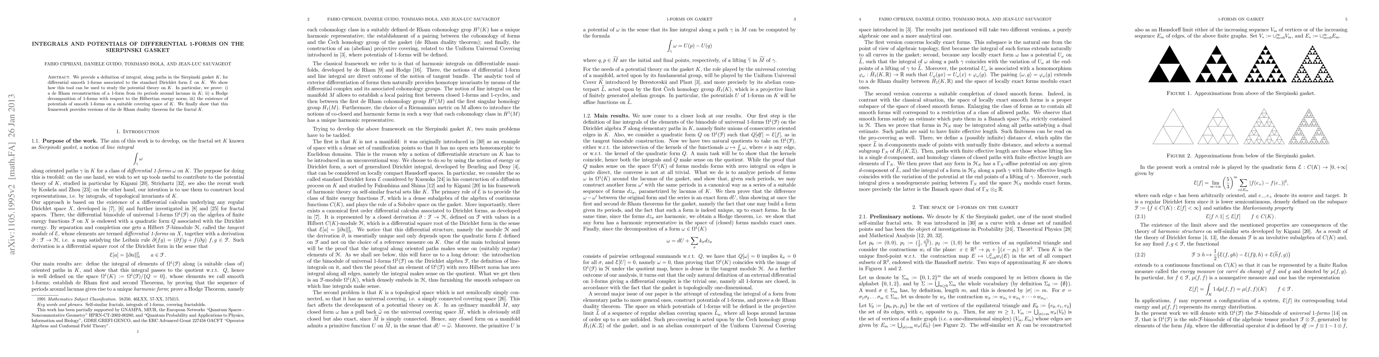 We provide a definition of integral, along paths in the Sierpinski gasket K, for differential smooth 1-forms associated to the standard Dirichlet form K. We show how this tool can be used to study the potential theory on K. In particular, we prove: i) a de Rham reconstruction of a 1-form from its periods around lacunas in K; ii) a Hodge decomposition of 1-forms with respect to the Hilbertian energy norm; iii) the existence of potentials of smooth 1-forms on a suitable covering space of K. We finally show that this framework provides versions of the de Rham duality theorem for the fractal K.