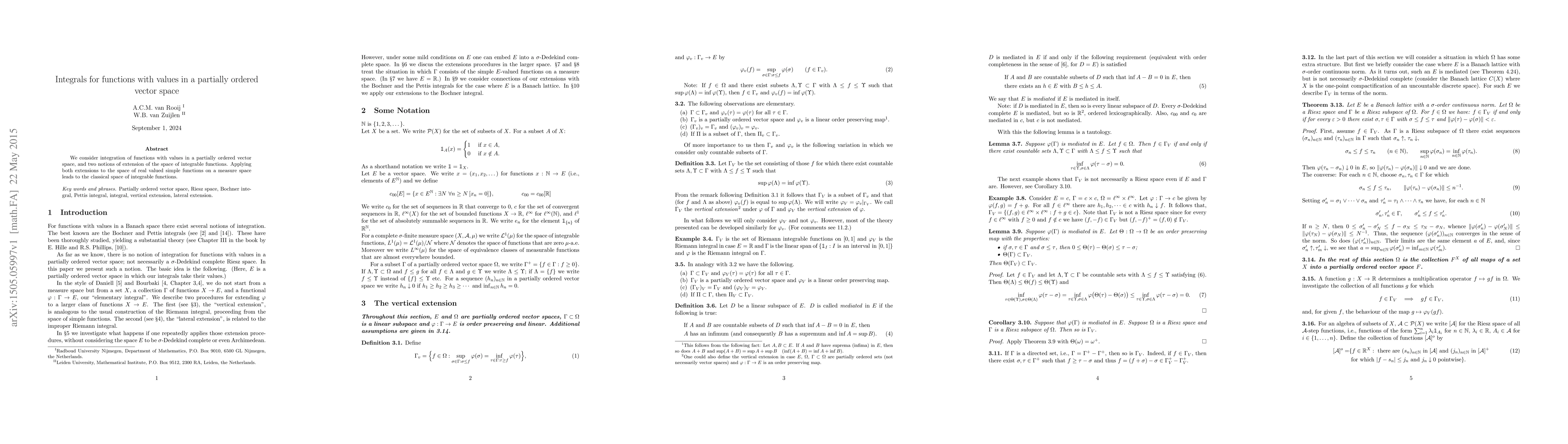 We consider integration of functions with values in a partially ordered vector space, and two notions of extension of the space of integrable functions. Applying both extensions to the space of real valued simple functions on a measure space leads to the classical space of integrable functions.