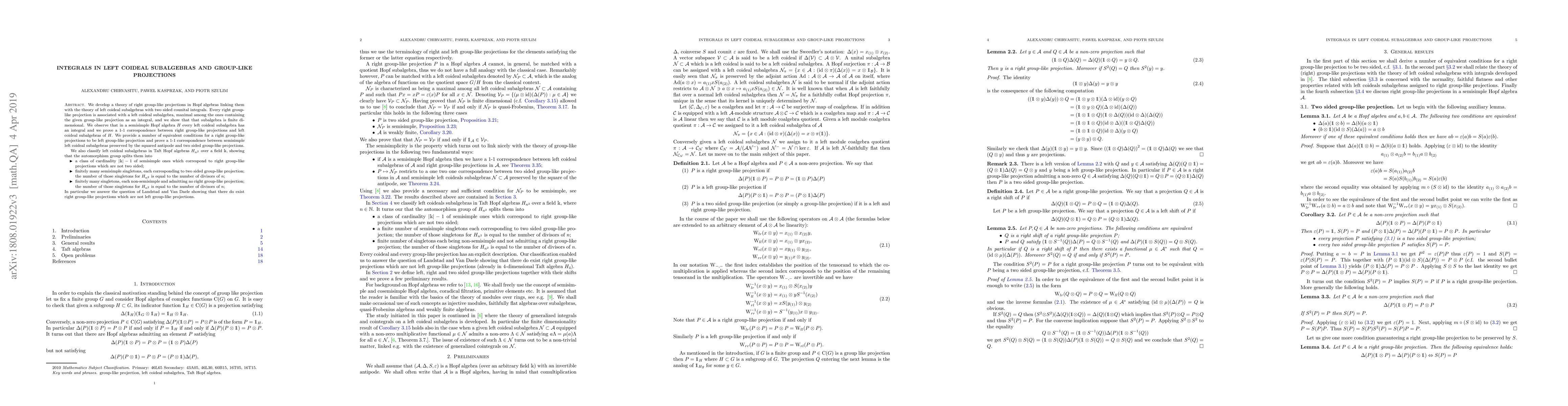 We develop a theory of right group-like projections in Hopf algebras linking them with the theory of left coideal subalgebras with two sided counital integrals. Every right group-like projection is associated with a left coideal subalgebra, maximal among the ones containing the given group-like projection as an integral, and we show that that subalgebra is finite dimensional. We observe that in a semisimple Hopf algebra $H$ every left coideal subalgebra has an integral and we prove a 1-1 correspondence between right group-like projections and left coideal subalgebras of $H$. We provide a number of equivalent conditions for a right group-like projections to be left group-like projection and prove a 1-1 correspondence between semisimple left coideal subalgebras preserved by the squared antipode and two sided group-like projections. We also classify left coideal subalgebras in Taft Hopf algebras $H_{n^2}$ over a field $\mathbb{k}$, showing that the automorphism group splits them into - a class of cardinality $|\mathbb{k}|-1$ of semisimple ones which correspond to right group-like projections which are not two sided; - finitely many semisimple singletons, each corresponding to two sided group-like projection; the number of those singletons for $H_{n^2}$ is equal to the number of divisors of $n$; - finitely many singletons, each non-semisimple and admitting no right group-like projection; the number of those singletons for $H_{n^2}$ is equal to the number of divisors of $n$. In particular we answer the question of Landstad and Van Daele showing that there do exist right group-like projections which are not left group-like projections.