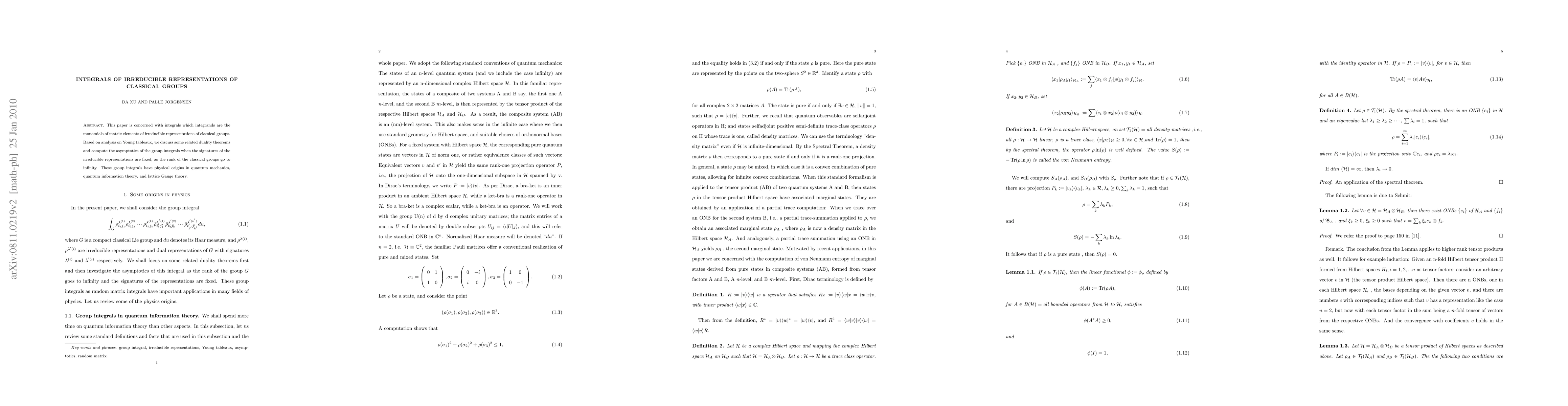 This paper is concerned with integrals which integrands are the monomials of matrix elements of irreducible representations of classical groups. Based on analysis on Young tableaux, we discuss some related duality theorems and compute the asymptotics of the group integrals when the signatures of the irreducible representations are fixed, as the rank of the classical groups go to infinity. These group integrals have physical origins in quantum mechanics, quantum information theory, and lattice Gauge theory.