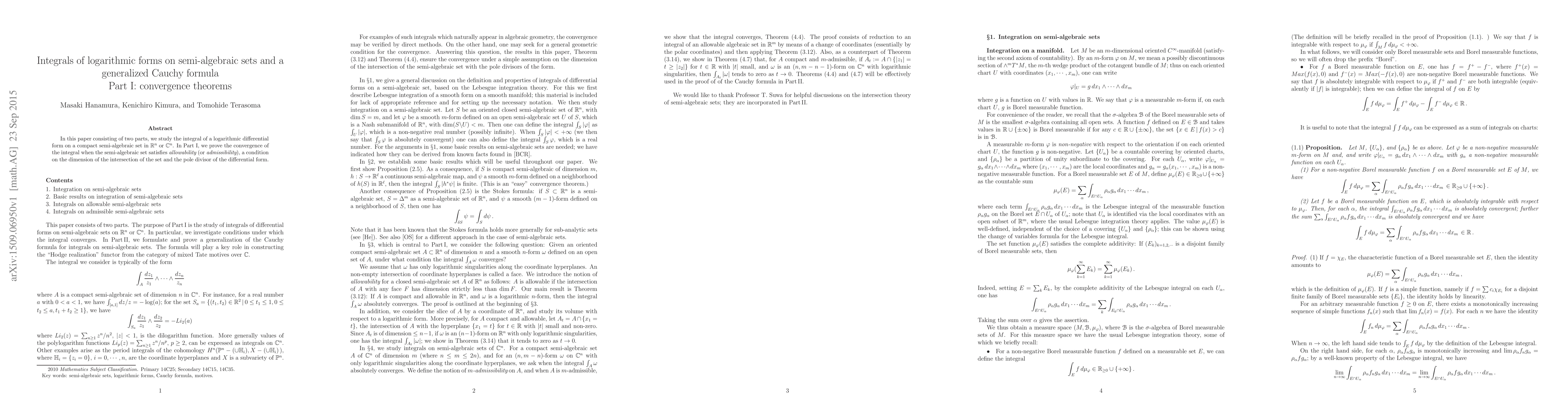 In this paper consisting of two parts, we study the integral of a logarithmic differential form on a compact semi-algebraic set in R^n or C^n. In Part I, we prove the convergence of the integral when the semi-algebraic set satisfies allowability (or admissibility), a condition on the dimension of the intersection of the set and the pole divisor of the differential form.