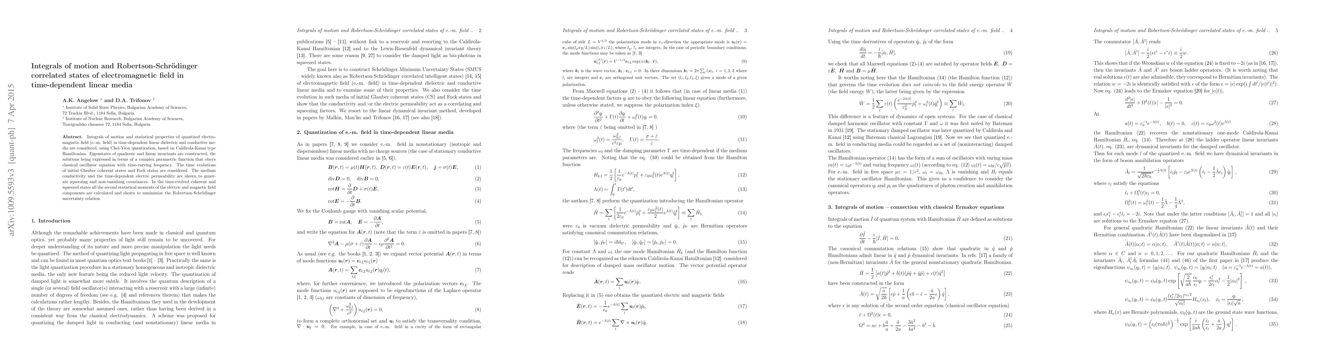This paper explores integrals of motion and statistical properties of the quantized electromagnetic field in time-dependent linear media using Choi-Yeon quantization. It constructs eigenstates of quadratic and linear invariants, revealing squeezing and non-vanishing covariances due to medium conductivity and time-dependent electric permeability, and demonstrates minimization of the Robertson-Schrödinger uncertainty relation in the time-evolved states.