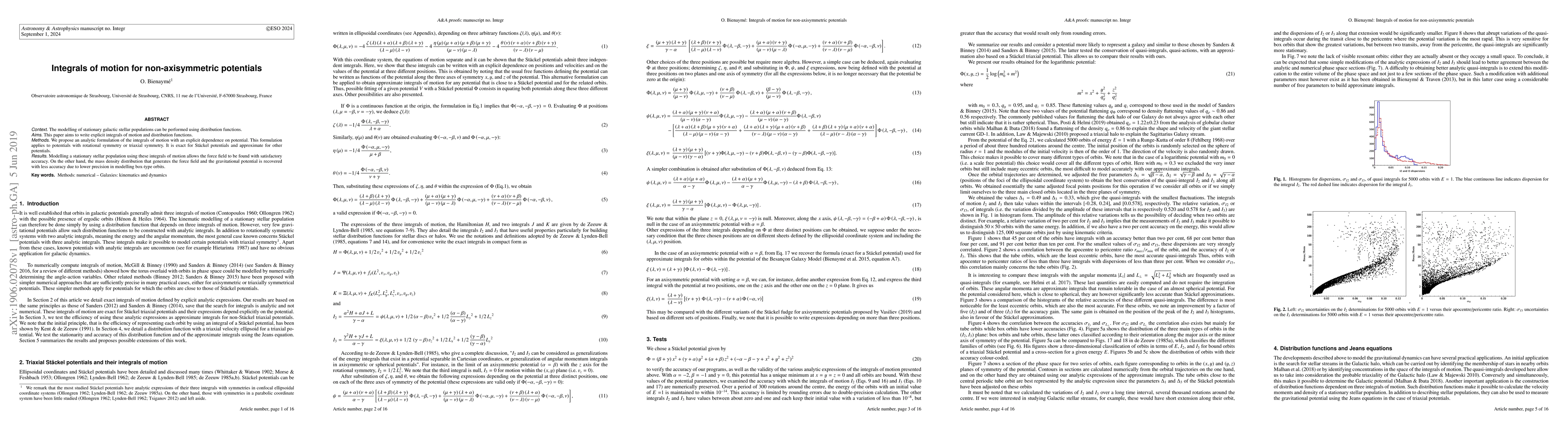 Context: The modelling of stationary galactic stellar populations can be performed using distribution functions. Aims: This paper aims to write explicit integrals of motion and distribution functions. Methods: We propose an analytic formulation of the integrals of motion with an explicit dependence on potential. This formulation applies to potentials with rotational symmetry or triaxial symmetry. It is exact for St\"ackel potentials and approximate for other potentials. Results: Modelling a stationary stellar population using these integrals of motion allows the force field to be found with satisfactory accuracy. On the other hand, the mass density distribution that generates the force field and the gravitational potential is recovered with less accuracy due to lower precision in modelling box-type orbits.