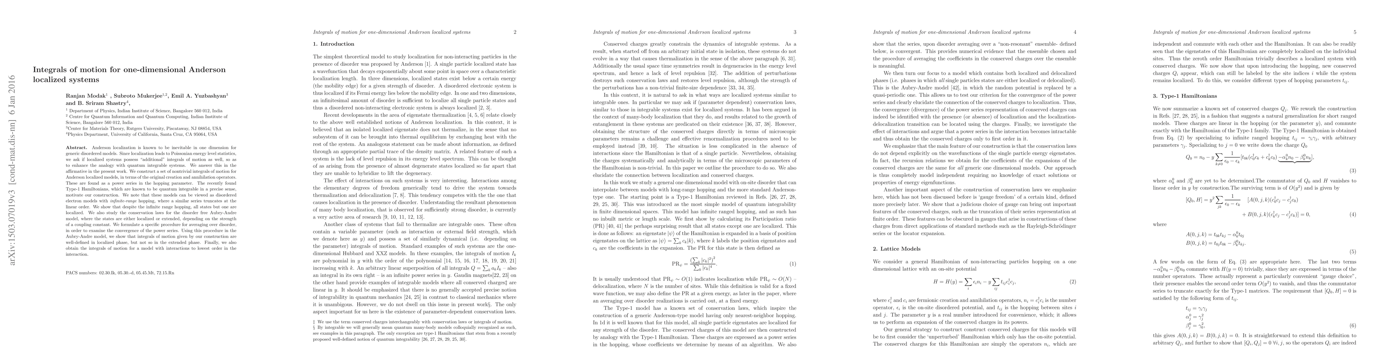 This paper constructs nontrivial integrals of motion for one-dimensional Anderson localized systems, enhancing the analogy with quantum integrable systems. The integrals are derived from creation and annihilation operators and validated via a convergence procedure in the Aubry-Andre model, showing they hold in the localized phase but not in the extended phase.