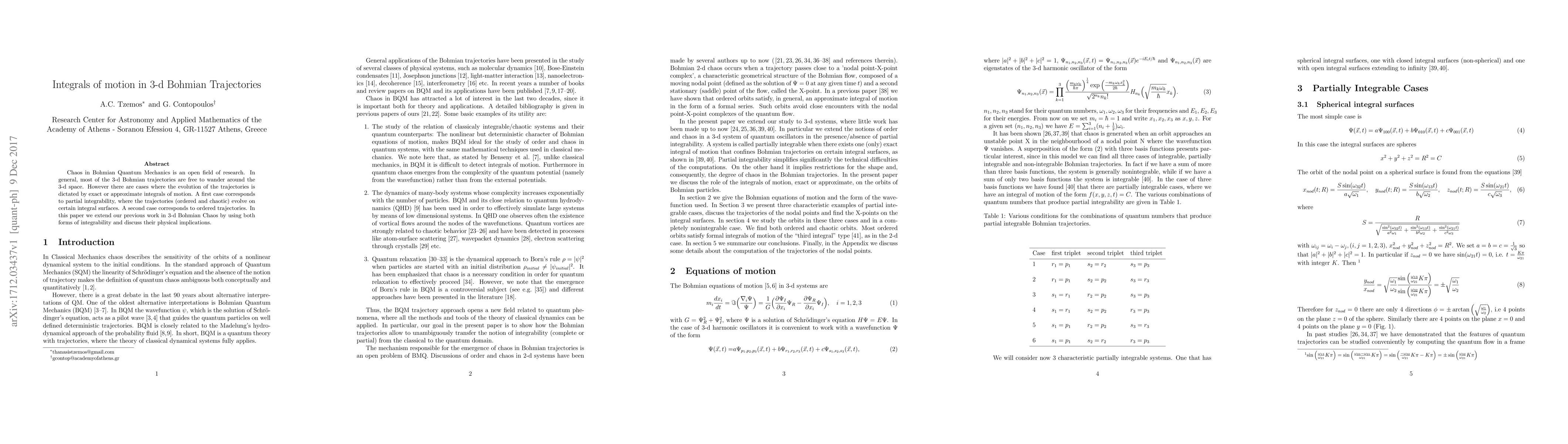 This paper explores the role of exact and approximate integrals of motion in dictating the evolution of 3-d Bohmian trajectories, distinguishing between partial integrability leading to ordered and chaotic trajectories, and fully ordered trajectories, to discuss their implications in Bohmian Quantum Mechanics.