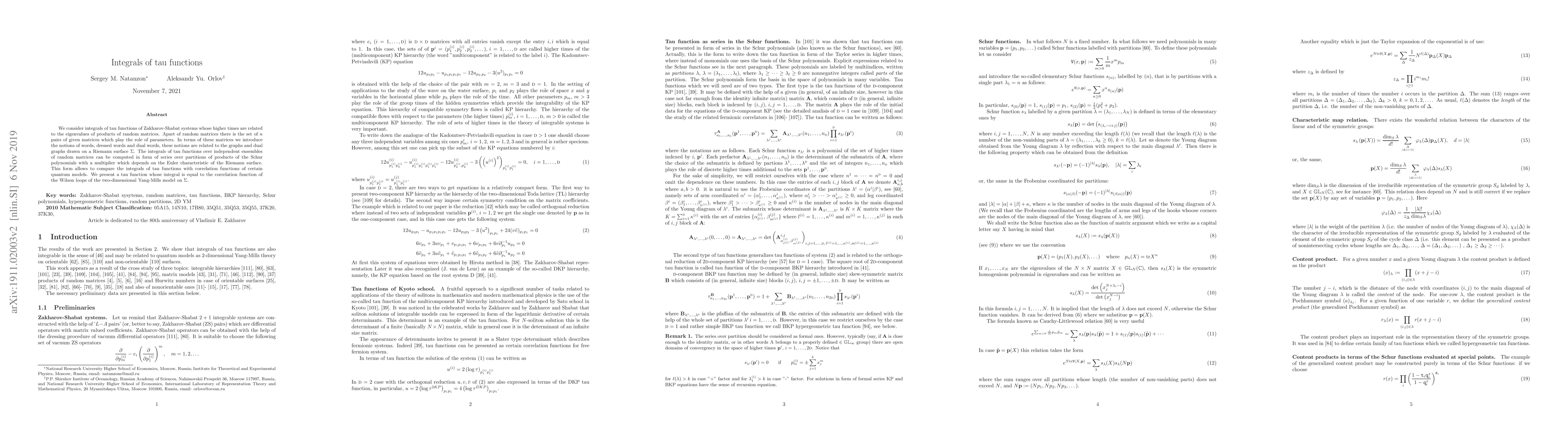 This paper explores integrals of tau functions associated with Zakharov-Shabat systems, linking them to eigenvalues of random matrix products and introducing notions of words and dressed words related to graphs on a Riemann surface. The integrals are expressed as series over Schur polynomials, facilitating comparisons with quantum model correlation functions, including the Wilson loops in the two-dimensional Yang-Mills model.