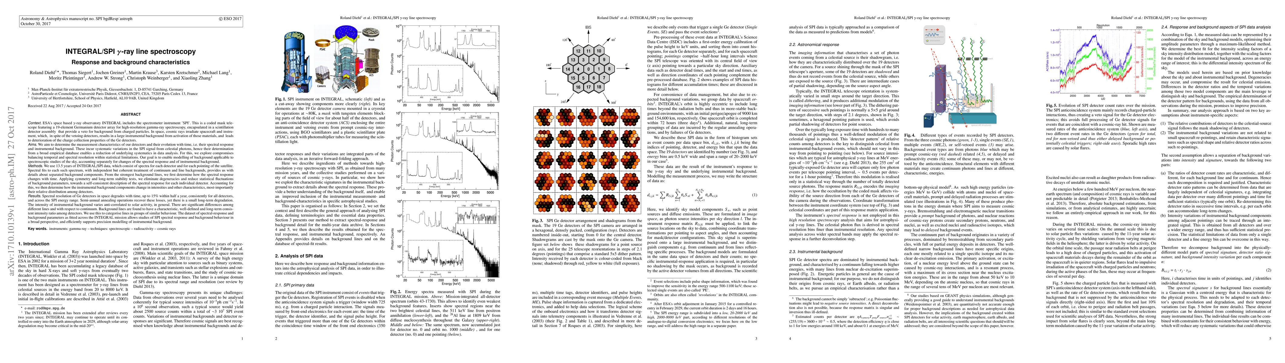 INTEGRAL/SPI is a space-based coded mask telescope featuring a 19-element Germanium detector array for high-resolution gamma-ray spectroscopy, encapsulated in a scintillation detector assembly that provide a veto for background from charged particles. In space, cosmic rays irradiate spacecraft and instrument, which results in a large instrumental background from activation of those materials, and leads to deterioration of the charge collection properties of the Ge detectors. We use 13.5 years of INTEGRAL/SPI spectra for each detector and for each pointing of the satellite. Spectral fits provide us with details about separated background components. From the strongest background lines, we first determine how the spectral response changes with time. We then determine how the instrumental background components change in intensities and other characteristics, most-importantly their relative distribution among detectors. Spectral resolution of Ge detectors in space degrades with time, up to 15% within half a year, consistently for all detectors, and across the SPI energy range. Semi-annual annealing operations recover these losses, yet there is a small long-term degradation. The intensity of instrumental background varies anti-correlated to solar activity, in general. There are significant differences among different lines and with respect to continuum. Background lines are found to have a characteristic, well-defined and long-term consistent intensity ratio among detectors. We use this to categorise lines in groups of similar behaviour. The dataset of spectral-response and background parameters as fitted across the INTEGRAL mission allows studies of SPI spectral response and background behaviour in a broad perspective, and efficiently supports precision modelling of instrumental background.