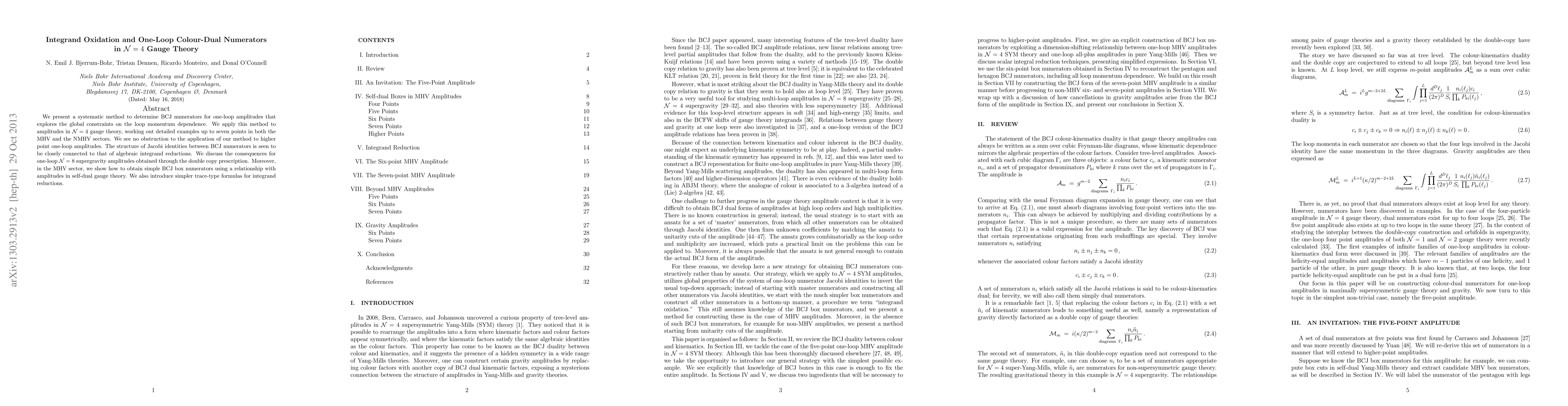 We present a systematic method to determine BCJ numerators for one-loop amplitudes that explores the global constraints on the loop momentum dependence. We apply this method to amplitudes in N=4 gauge theory, working out detailed examples up to seven points in both the MHV and the NMHV sectors. The structure of Jacobi identities between BCJ numerators is seen to be closely connected to that of algebraic integrand reductions. We discuss the consequences for one-loop N=8 supergravity amplitudes obtained through the double copy prescription. Moreover, in the MHV sector, we show how to obtain simple BCJ box numerators using a conjectured relationship to amplitudes in self-dual gauge theory. We also introduce simpler trace-type formulas for integrand reductions.
