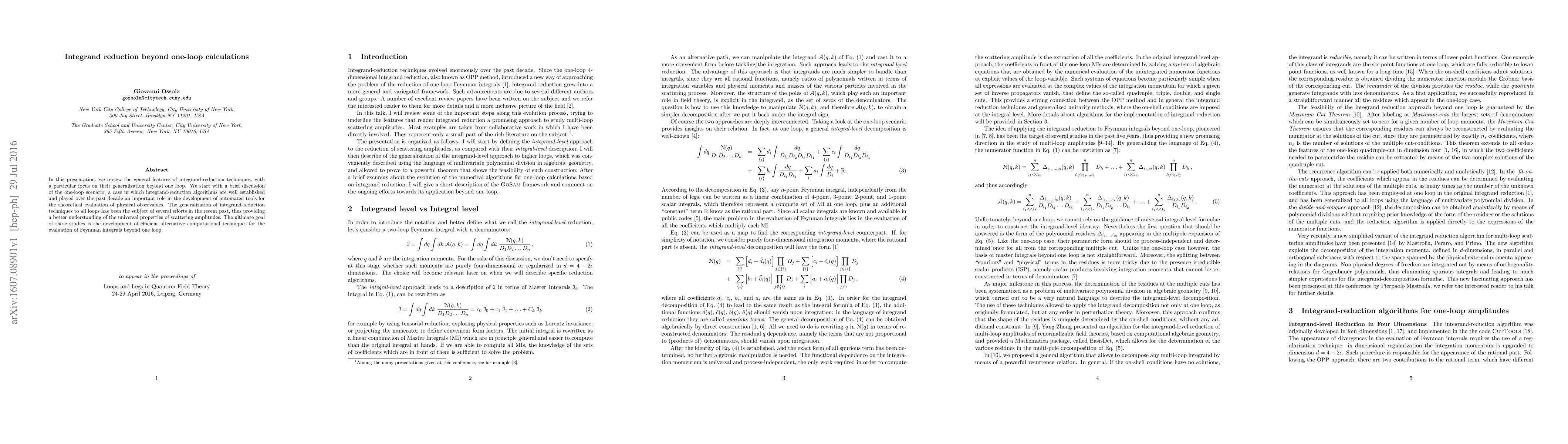 This paper reviews integrand-reduction techniques, emphasizing their extension beyond one-loop calculations to improve the evaluation of Feynman integrals and scattering amplitudes, thereby advancing computational methods for theoretical physics.