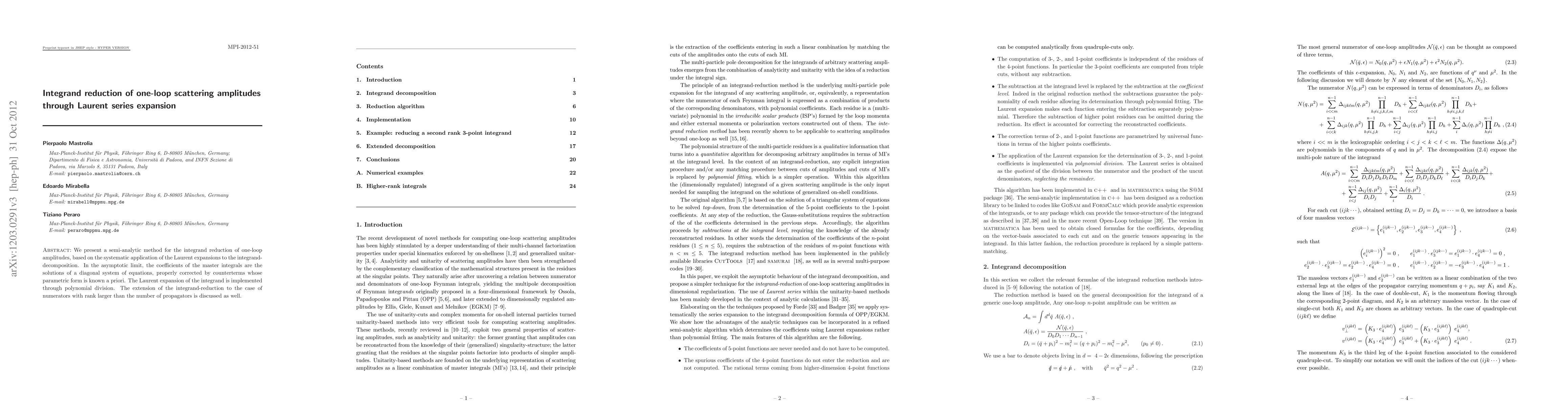 This paper introduces a semi-analytic method for reducing the integrands of one-loop scattering amplitudes using Laurent series expansions, leading to a diagonal system of equations for master integrals' coefficients, corrected by known counterterms. The method extends to integrands with higher-rank numerators.