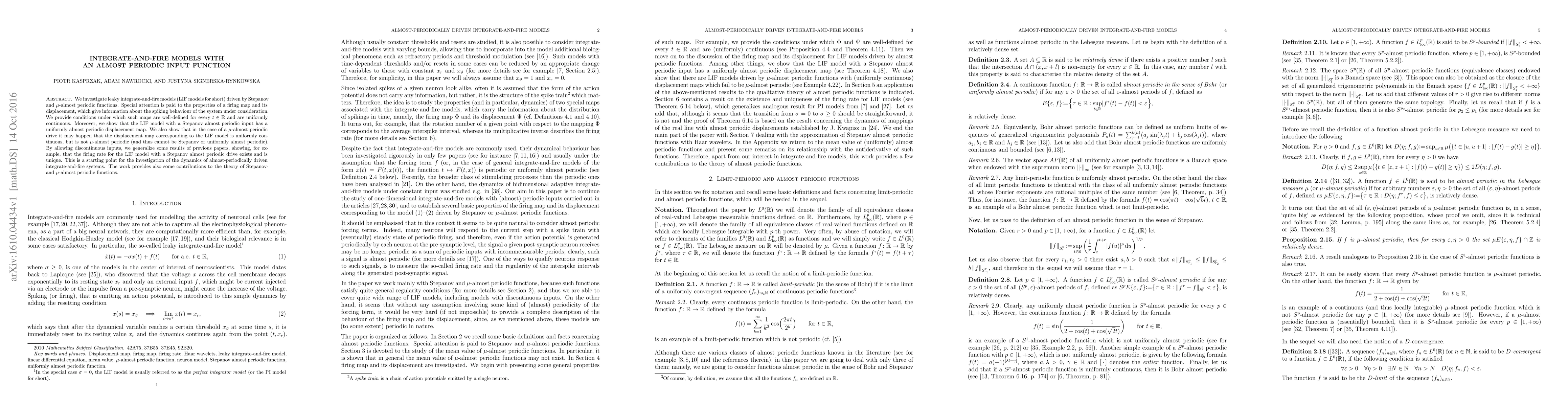 We investigate leaky integrate-and-fire models (LIF models for short) driven by Stepanov and $\mu$-almost periodic functions. Special attention is paid to the properties of a firing map and its displacement, which give information about the spiking behaviour of the system under consideration. We provide conditions under which such maps are well-defined for every $t \in \mathbb R$ and are uniformly continuous. Moreover, we show that the LIF model with a Stepanov almost periodic input has a uniformly almost periodic displacement map. We also show that in the case of a $\mu$-almost periodic drive it may happen that the displacement map corresponding to the LIF model is uniformly continuous, but is not $\mu$-almost periodic (and thus cannot be Stepanov or uniformly almost periodic). By allowing discontinuous inputs, we generalize some results of previous papers, showing, for example, that the firing rate for the LIF model with a Stepanov almost periodic drive exists and is unique. This is a starting point for the investigation of the dynamics of almost-periodically driven integrate-and-fire systems. The work provides also some contributions to the theory of Stepanov- and $\mu$-almost periodic functions.
